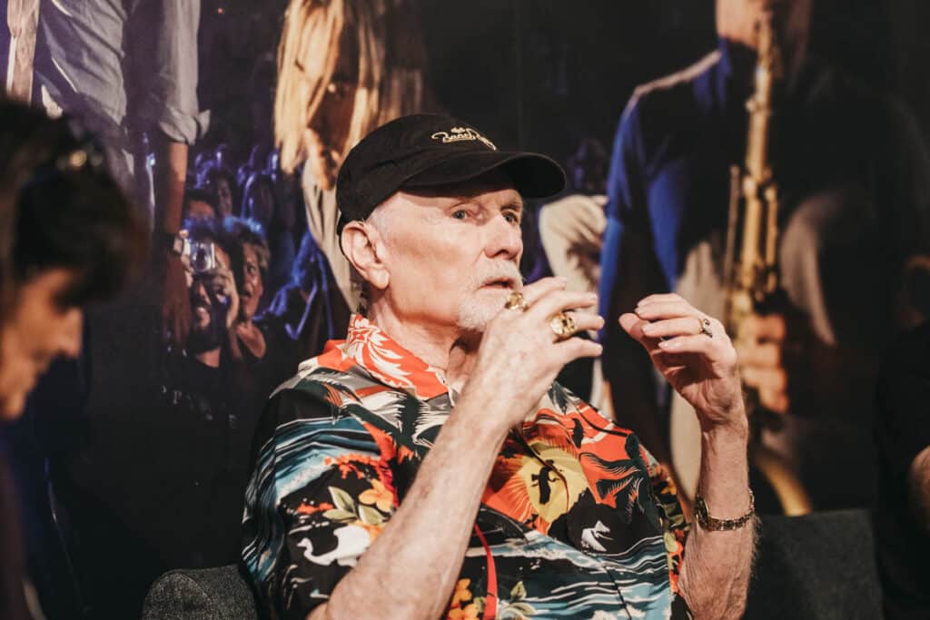 Con camisa surfera, chanclas y gorra, Love ha comparecido este martes en una rueda de prensa para hablar del concierto que ofrecerá mañana en el Auditorio Kursaal la mítica banda californiana en la que está también Bruce Johnston, que se incorporó en 1965.