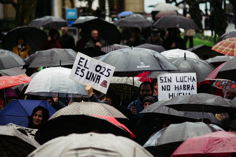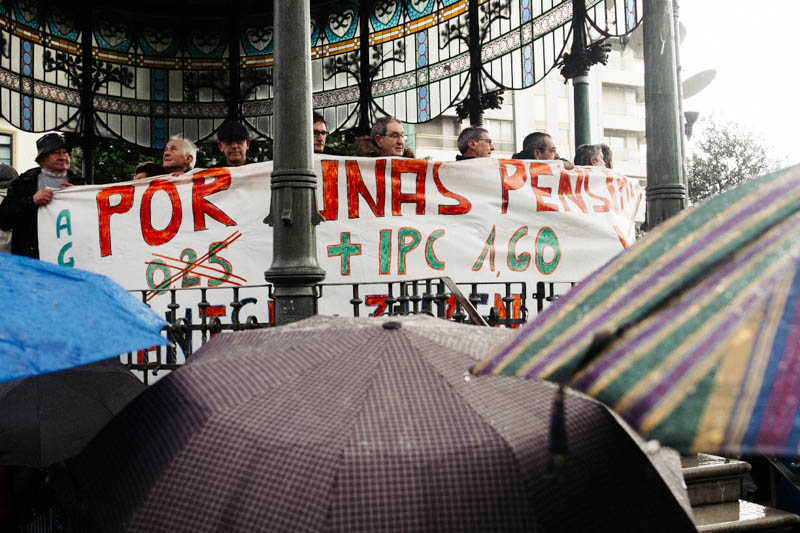 La lluvia, que podía haber entorpecido la marcha, ni siquiera ha enfriado el ambiente. Pancartas por «unas pensiones dignas», otras parodiando la subida del 0,25, «Sin lucha no habrá hucha», decían algunas, y muchas, muchas (igual que los lemas) a favor de unas pensiones cuyo suelo sea de 1.080 euros para tener una vida digna.