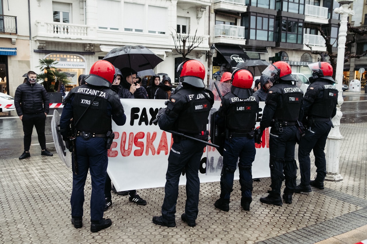 En ese instante, los ertzainas han acometido contra los concentrados, que portaban una pancarta con el lema «Faxismoaren aurrean Euskal Herria antolatu» (Organizar Euskal Herria ante el fascismo), y que se han dispersado por los alrededores sin que se hayan producido mayores incidentes.