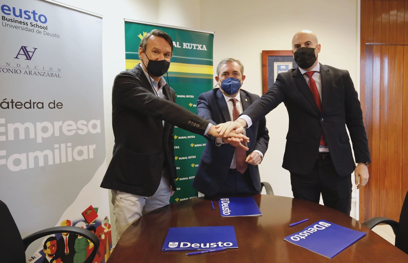 Rural Kutxa, Fundación Antonio Aranzábal y Deusto Business School (DBS) han firmado hoy en el campus de la Universidad de Deusto en San Sebastián un acuerdo para desarrollar el proyecto piloto Programa de Prácticas Empresa Familiar y Talento (PREFYT).