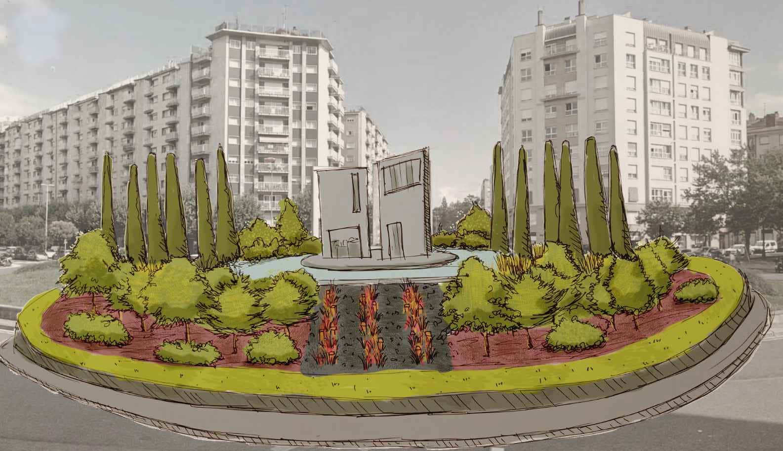 La concejala de Ecología, Marisol Garmendia, destacó que “se pretende, además, poner en valor el conjunto escultórico que preside la rotonda, que recuerda los sucesos trágicos del 31 de agosto de 1813 y que es obra de Aitor Mendizabal”.