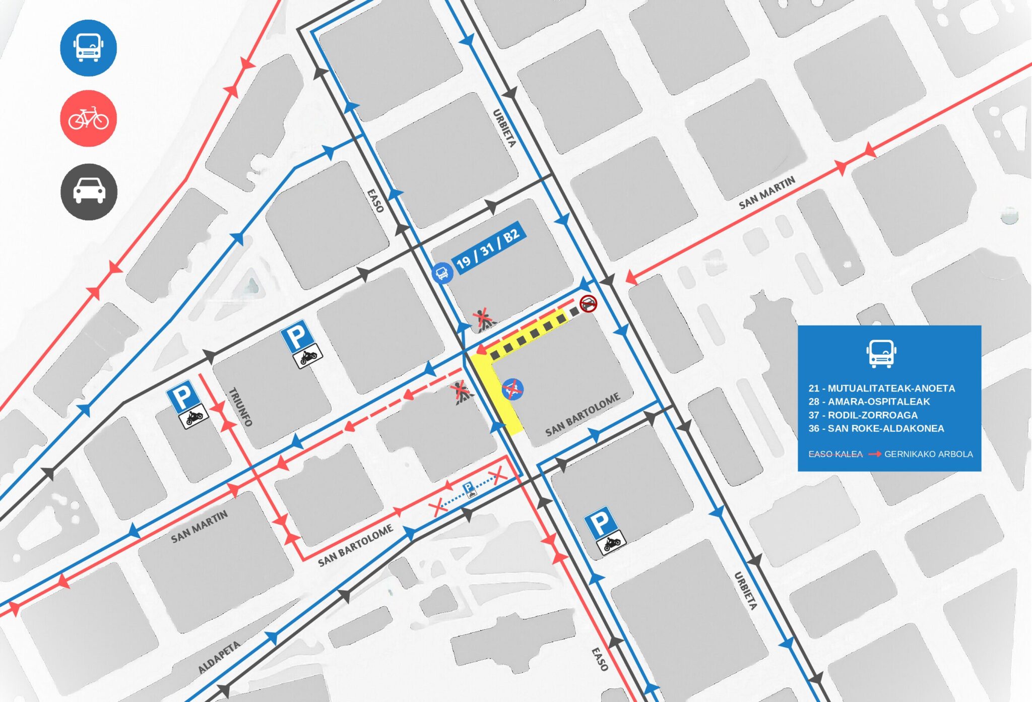 En la calle Easo se ha producido el corte de dos carriles de circulación entre las calles San Martín y San Bartolomé y se ha sustituido el actual bidegorri por un carril. En la calle San Martín, por su parte, se ha cortado el bidegorri y un carril de circulación entre las calles Urbieta y Easo, manteniéndose abierto el carril bus.