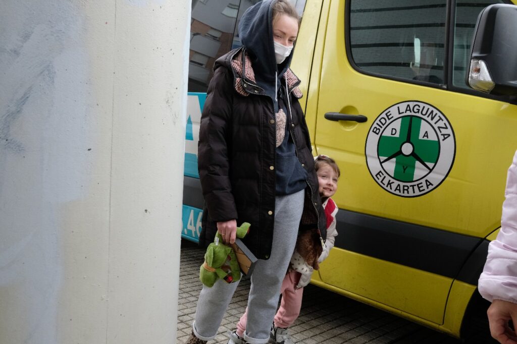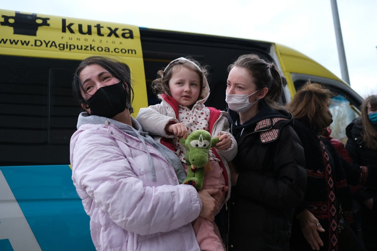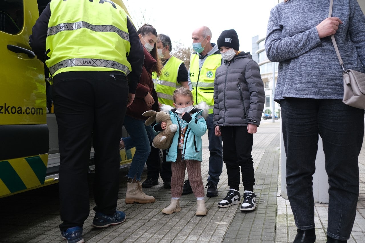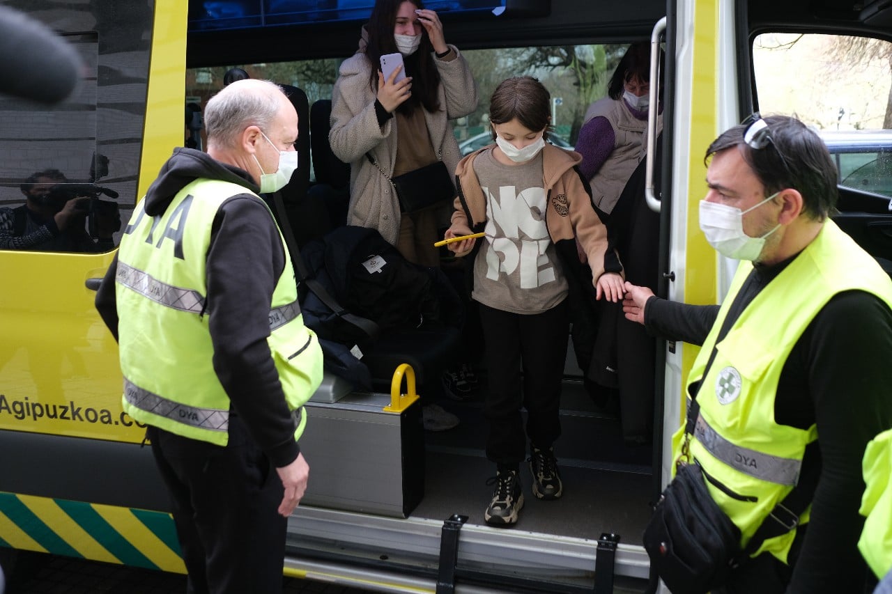 Este mediodía han llegado a Donostia los 17 ucranianos (cinco son niños de 3,5,7,10 y 14 años) que tres furgonetas de DYA fueron a recoger a la frontera de Polonia en un trayecto que comenzó el pasado martes.