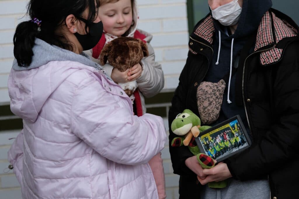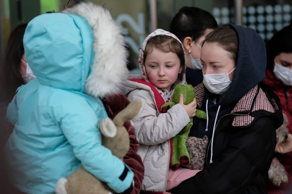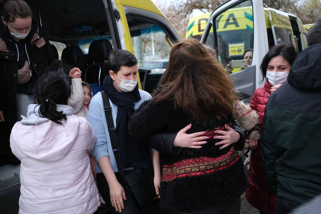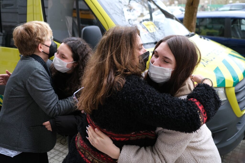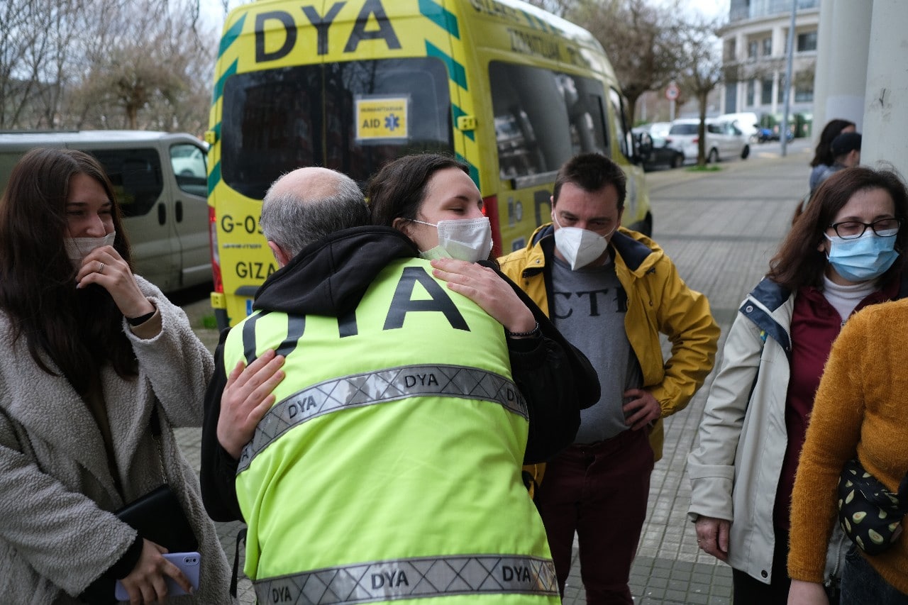 Este mediodía han llegado a Donostia los 17 ucranianos (cinco son niños de 3,5,7,10 y 14 años) que tres furgonetas de DYA fueron a recoger a la frontera de Polonia en un trayecto que comenzó el pasado martes.