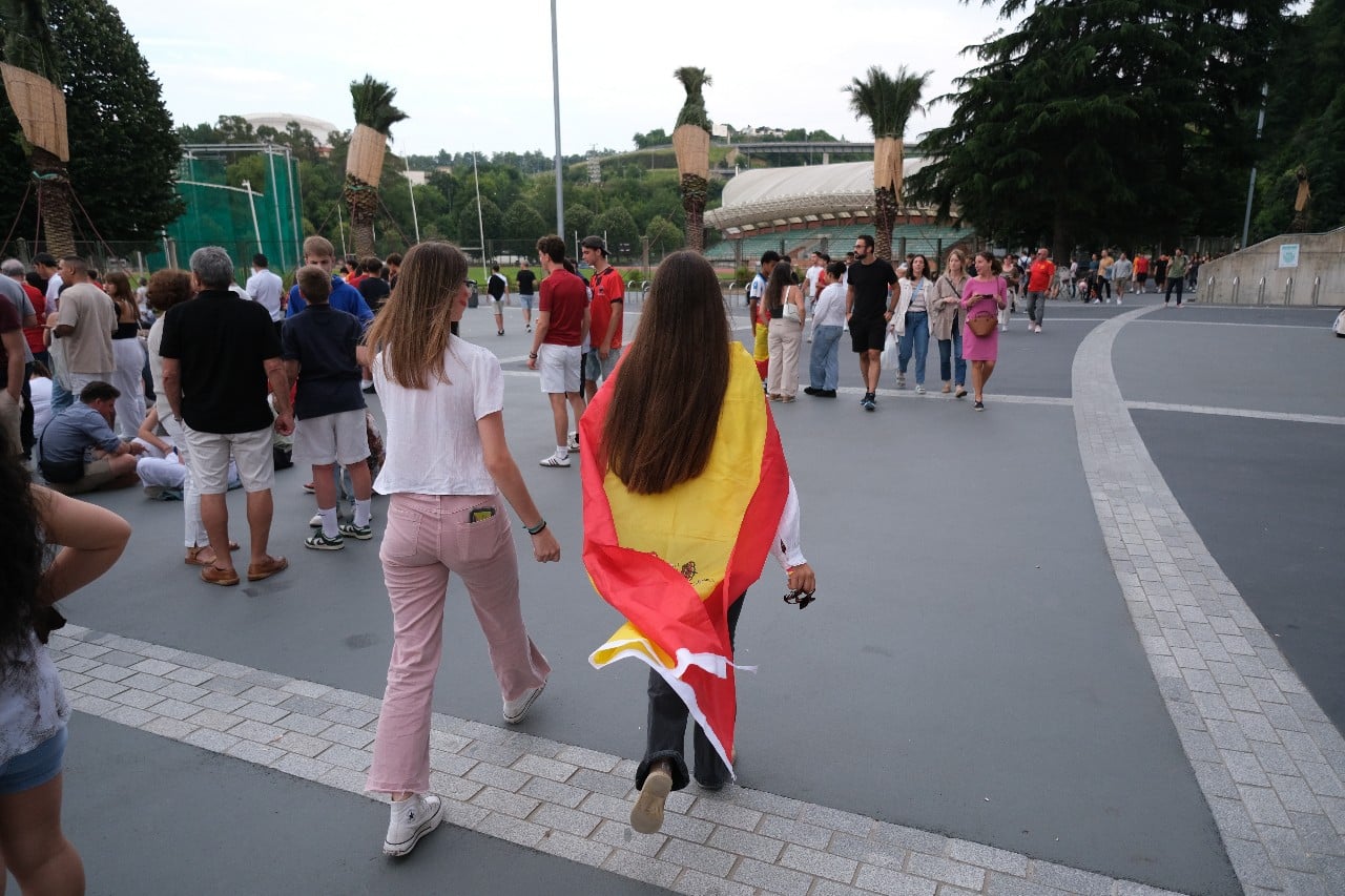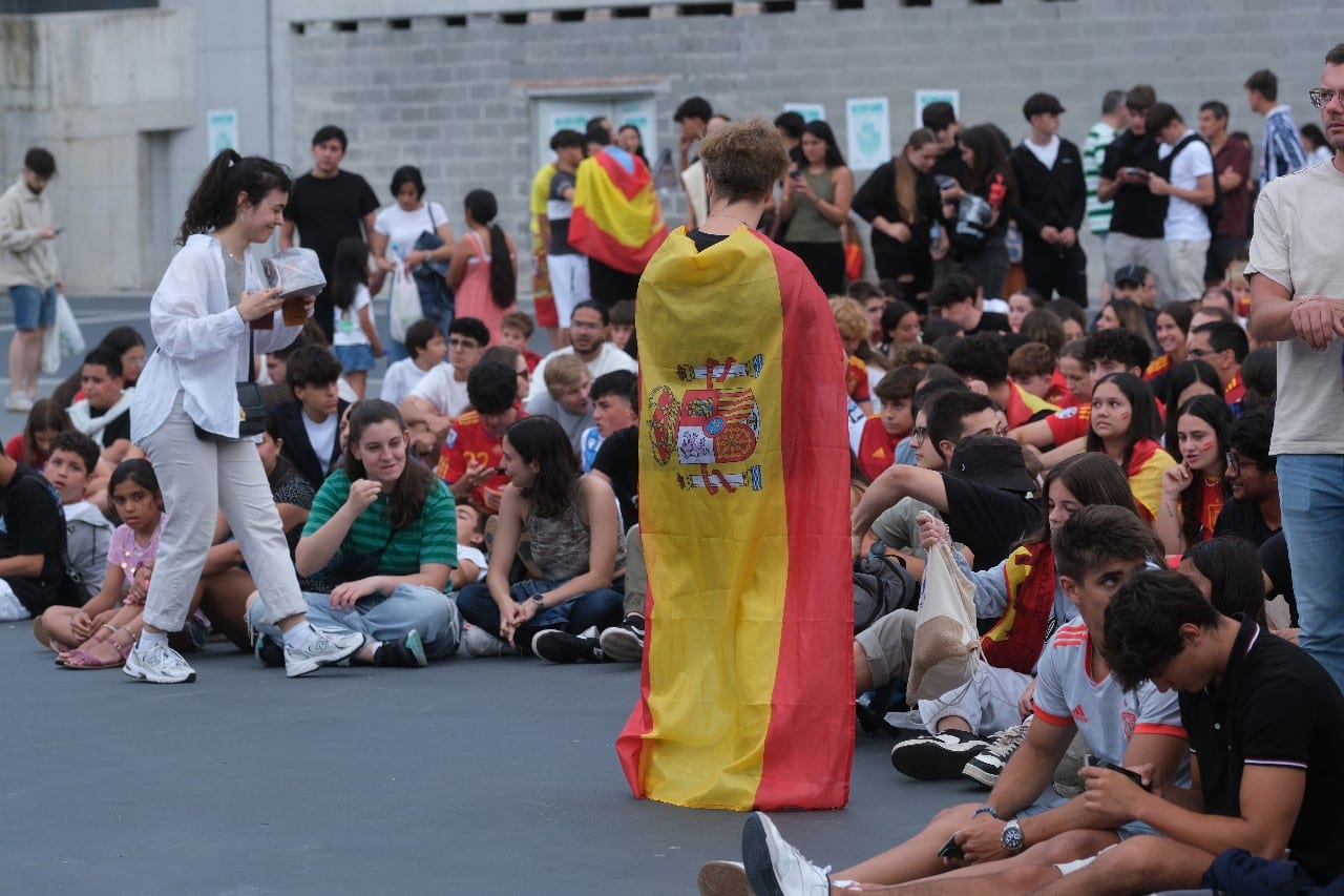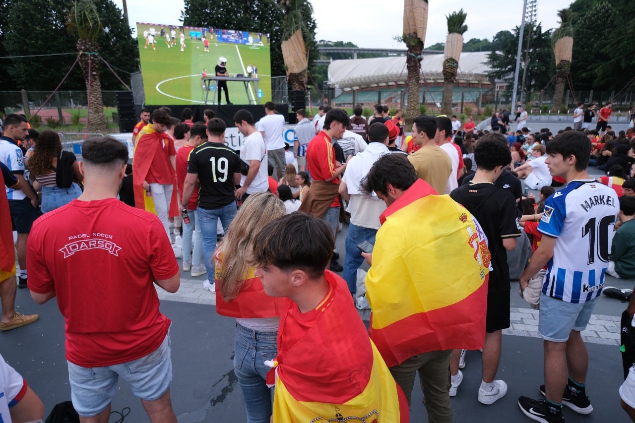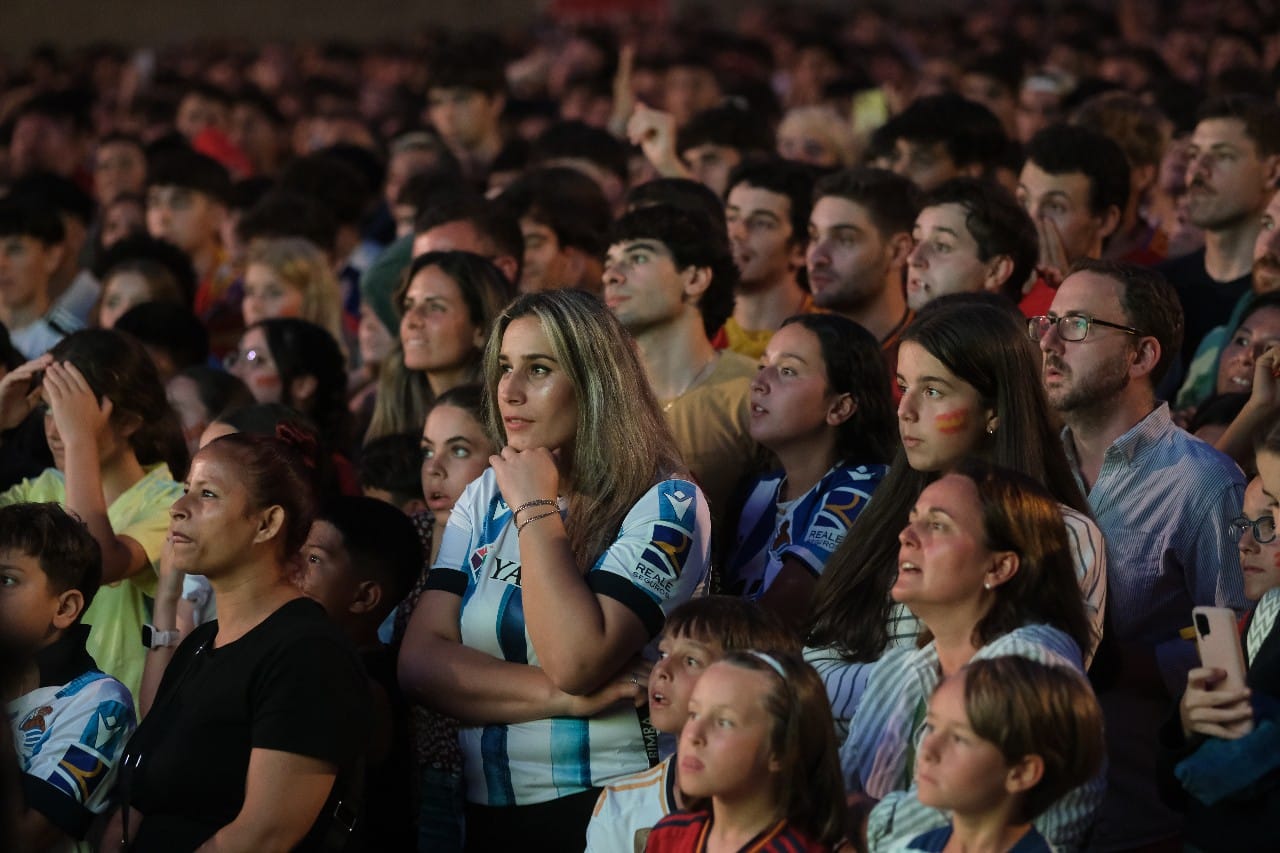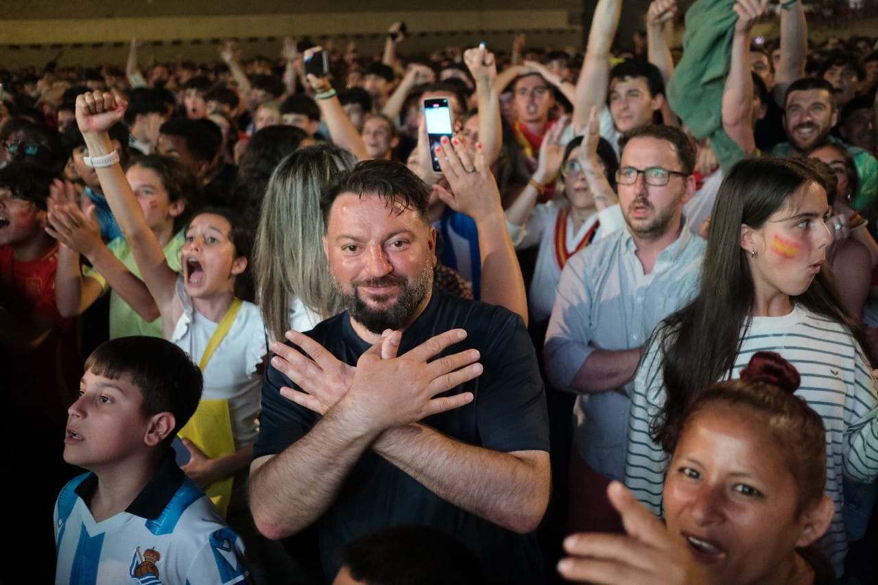 No era tan «gigante» como se decía, pero eso ha sido lo de menos y la final de la Eurocopa España-Inglaterra ha congregado a numerosos donostiarras frente a la pantalla que Donostia Kirola ha instalado en Anoeta para la multitud que ha querido disfrutar del espectáculo deportivo con mucha compañía. Un DJ fue el encargado de amenizar la espera y de generar el buen ambiente que ha ido creciendo hasta el subidón del gol de Nico Williams y la locura, cómo no, del tanto de la victoria del txuriurdin Mikel Oyarzabal.