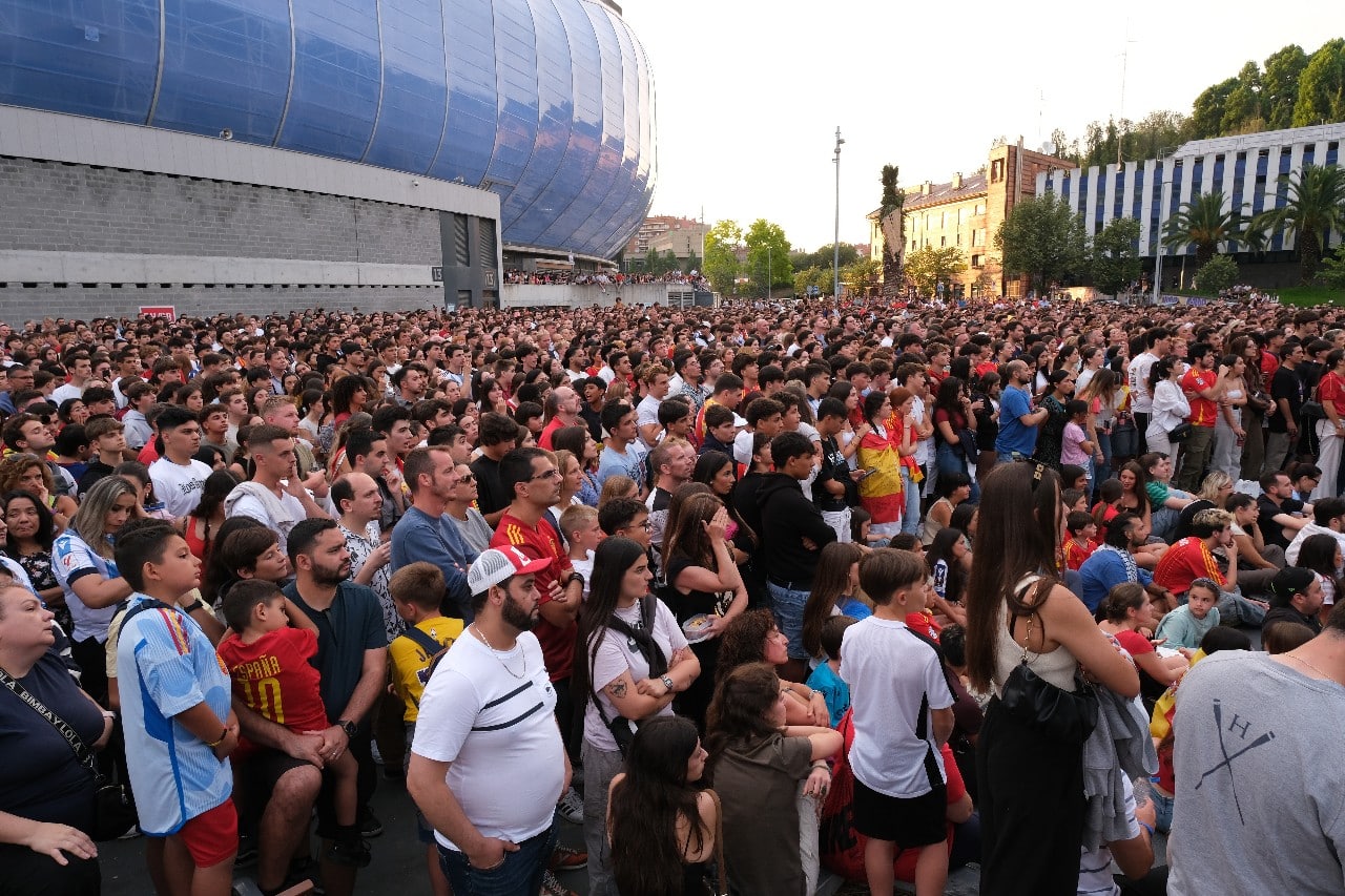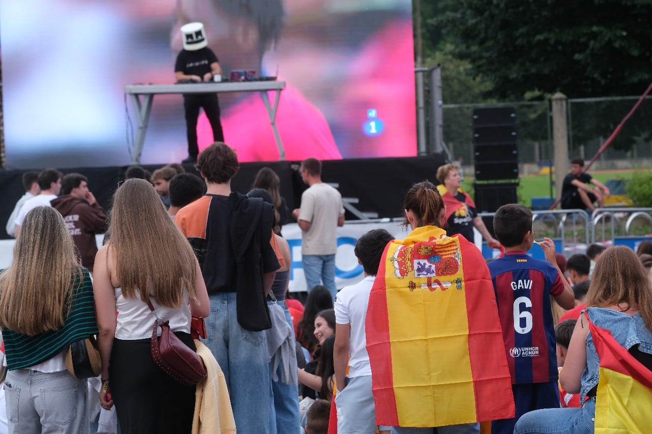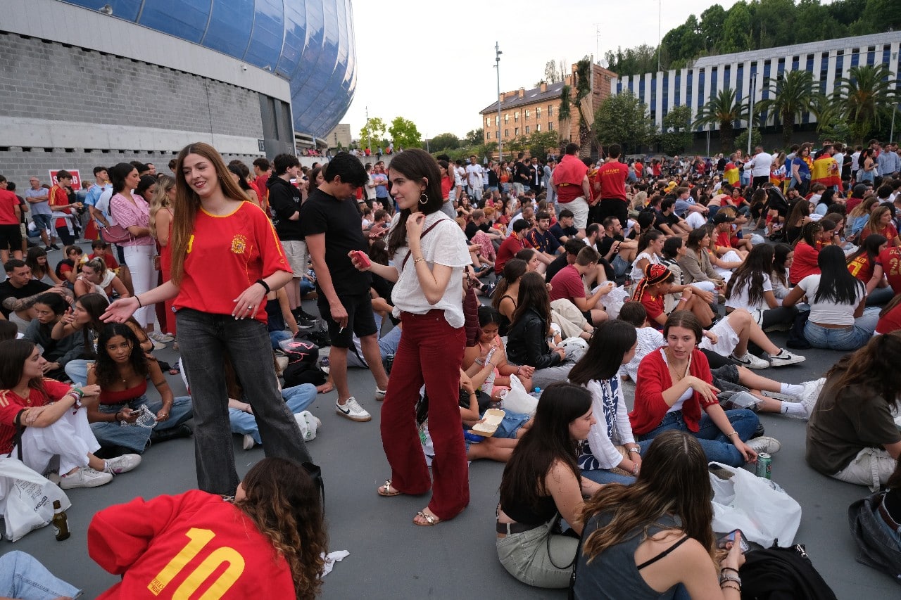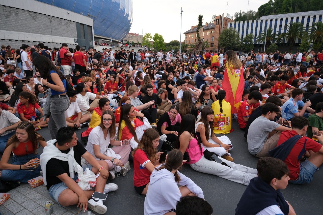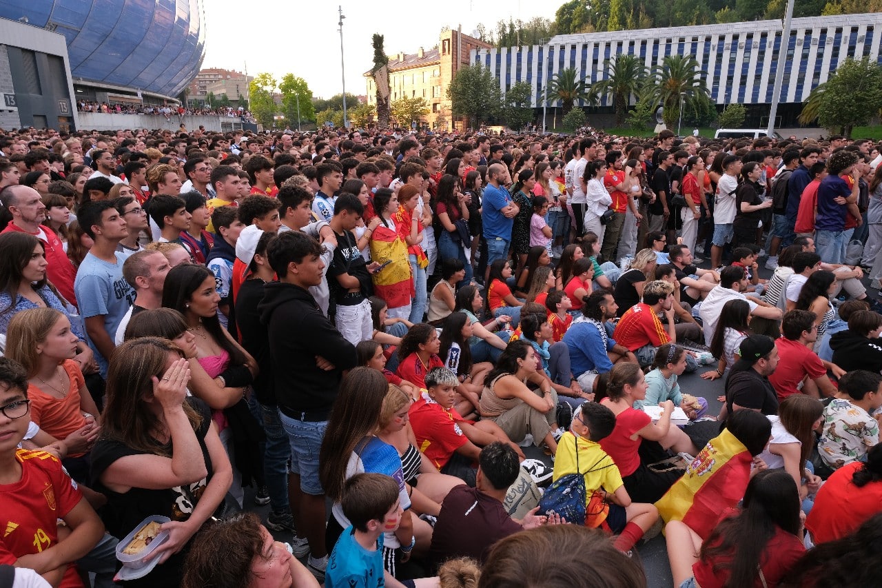 No era tan «gigante» como se decía, pero eso ha sido lo de menos y la final de la Eurocopa España-Inglaterra ha congregado a numerosos donostiarras frente a la pantalla que Donostia Kirola ha instalado en Anoeta para la multitud que ha querido disfrutar del espectáculo deportivo con mucha compañía. Un DJ fue el encargado de amenizar la espera y de generar el buen ambiente que ha ido creciendo hasta el subidón del gol de Nico Williams y la locura, cómo no, del tanto de la victoria del txuriurdin Mikel Oyarzabal.