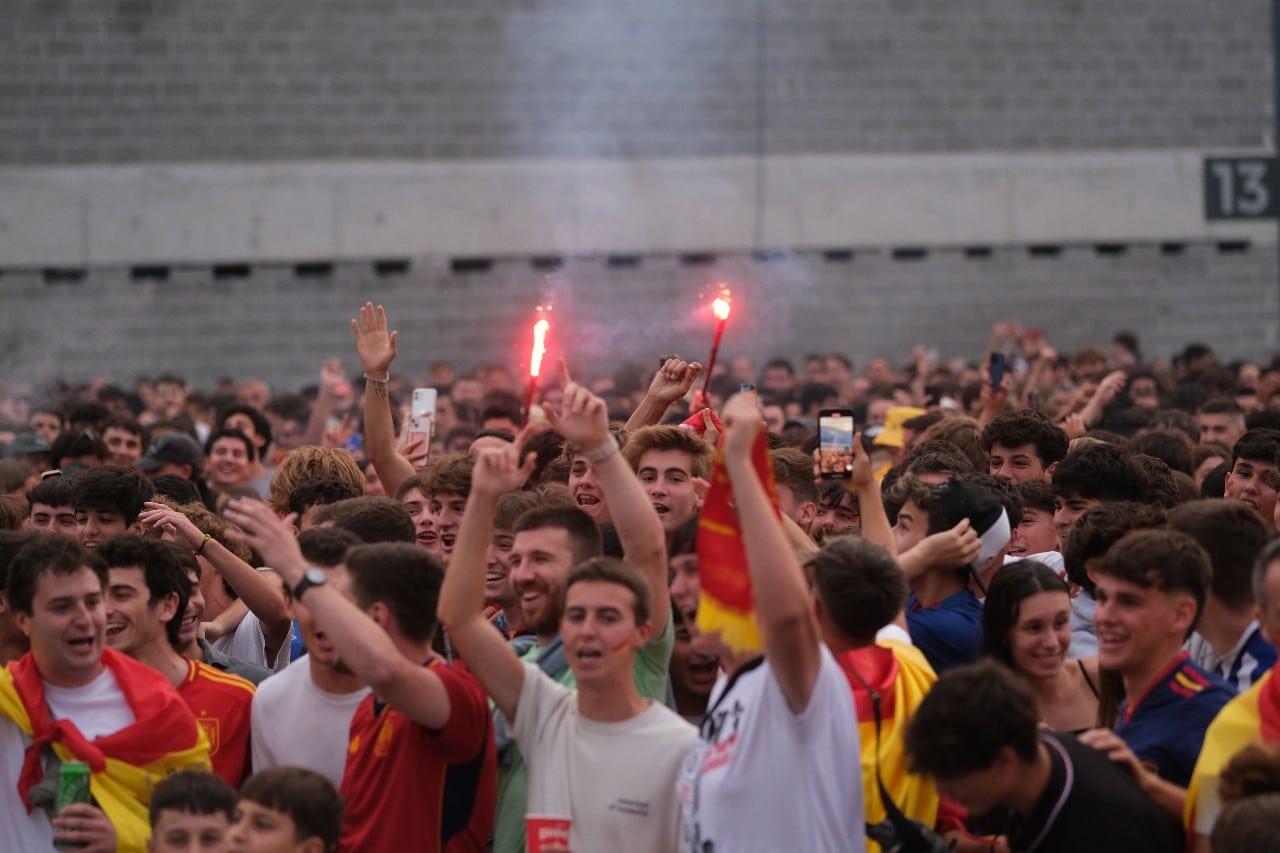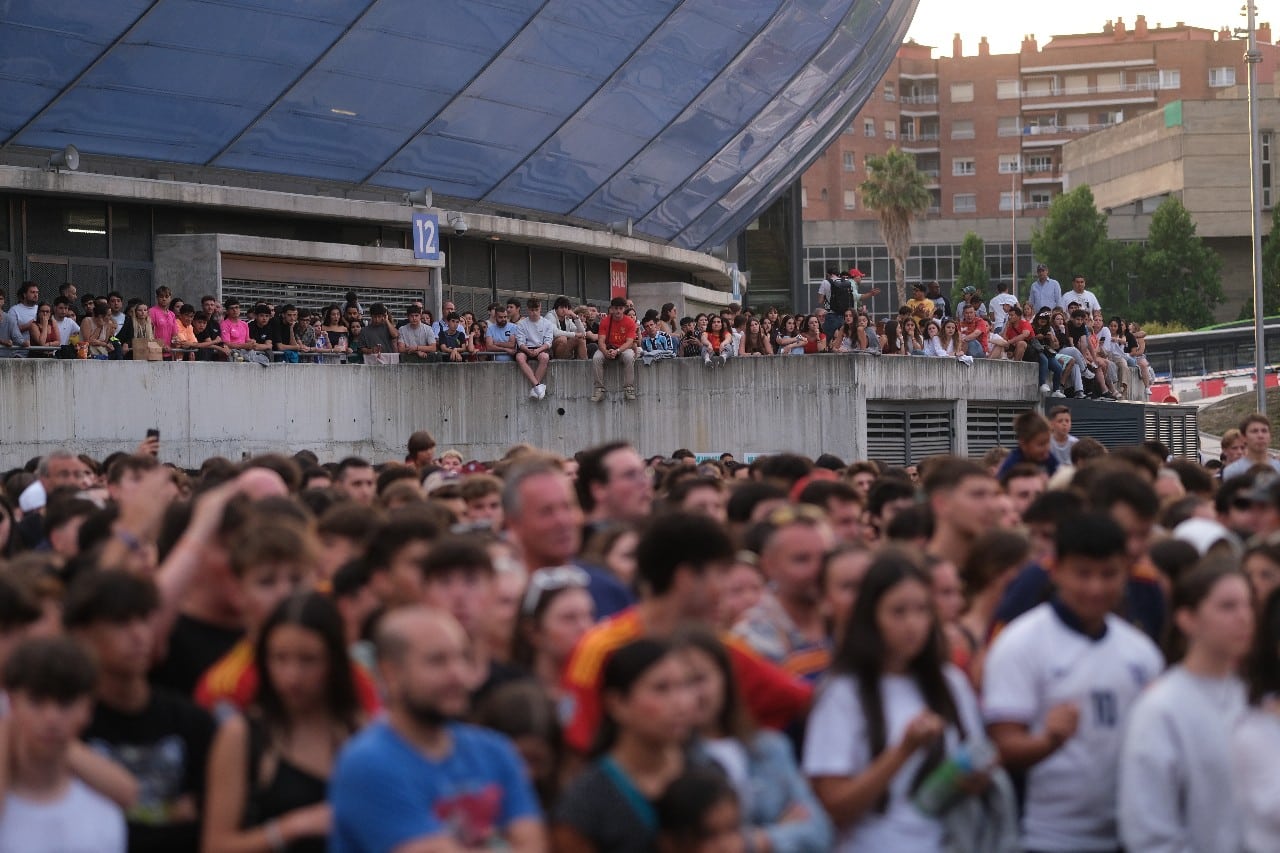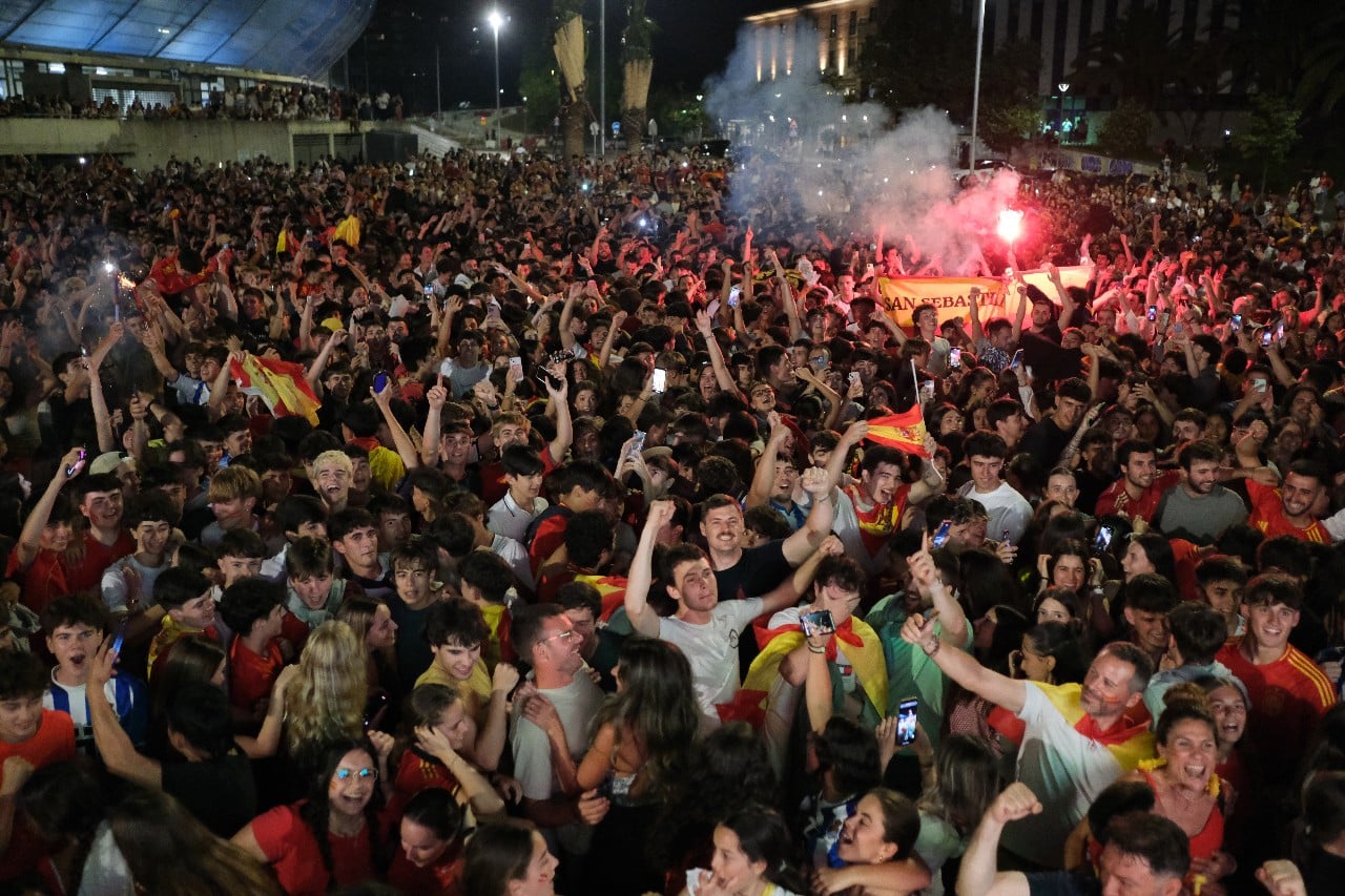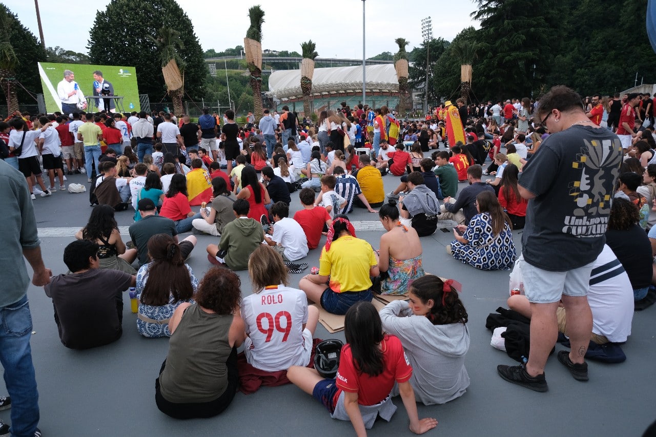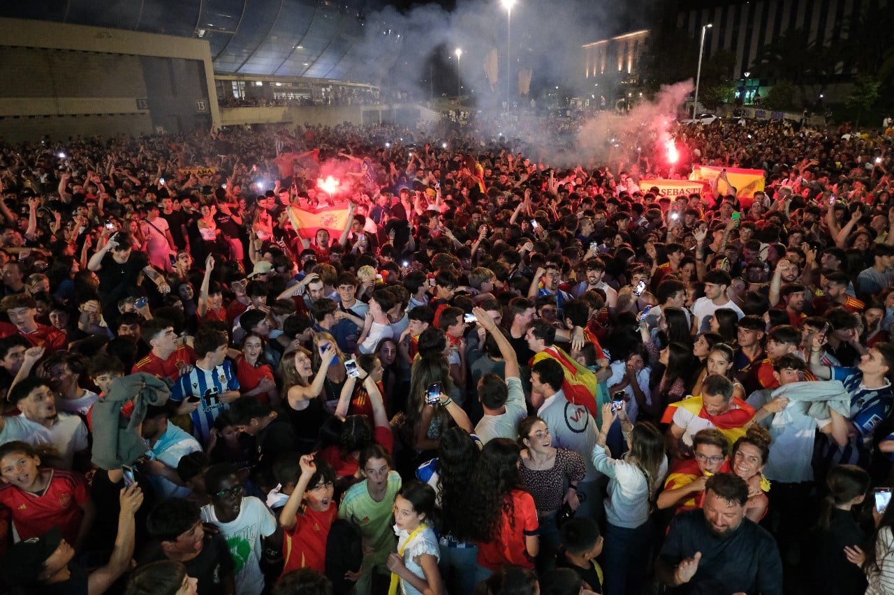 No era tan «gigante» como se decía, pero eso ha sido lo de menos y la final de la Eurocopa España-Inglaterra ha congregado a numerosos donostiarras frente a la pantalla que Donostia Kirola ha instalado en Anoeta para la multitud que ha querido disfrutar del espectáculo deportivo con mucha compañía. Un DJ fue el encargado de amenizar la espera y de generar el buen ambiente que ha ido creciendo hasta el subidón del gol de Nico Williams y la locura, cómo no, del tanto de la victoria del txuriurdin Mikel Oyarzabal.