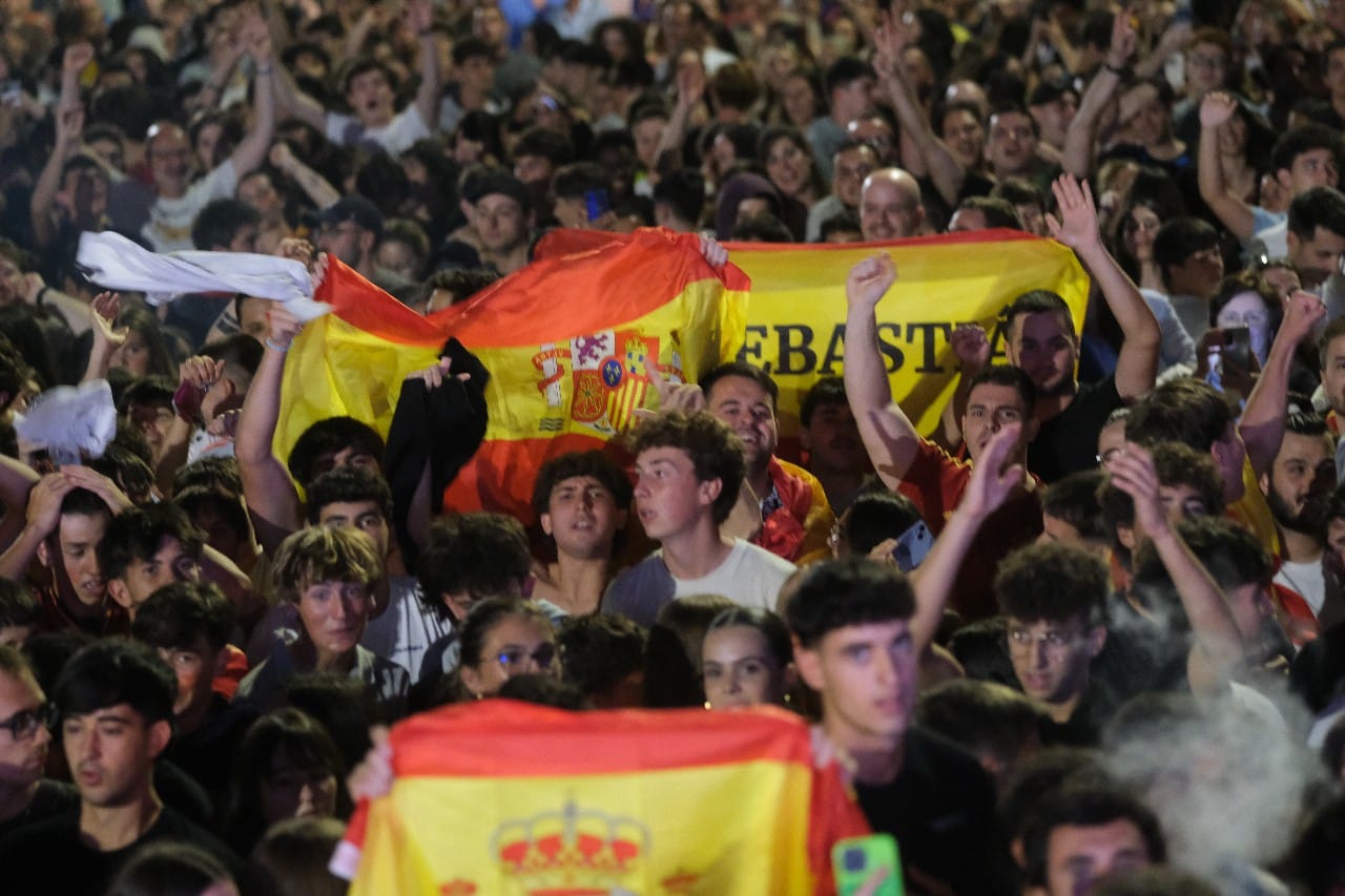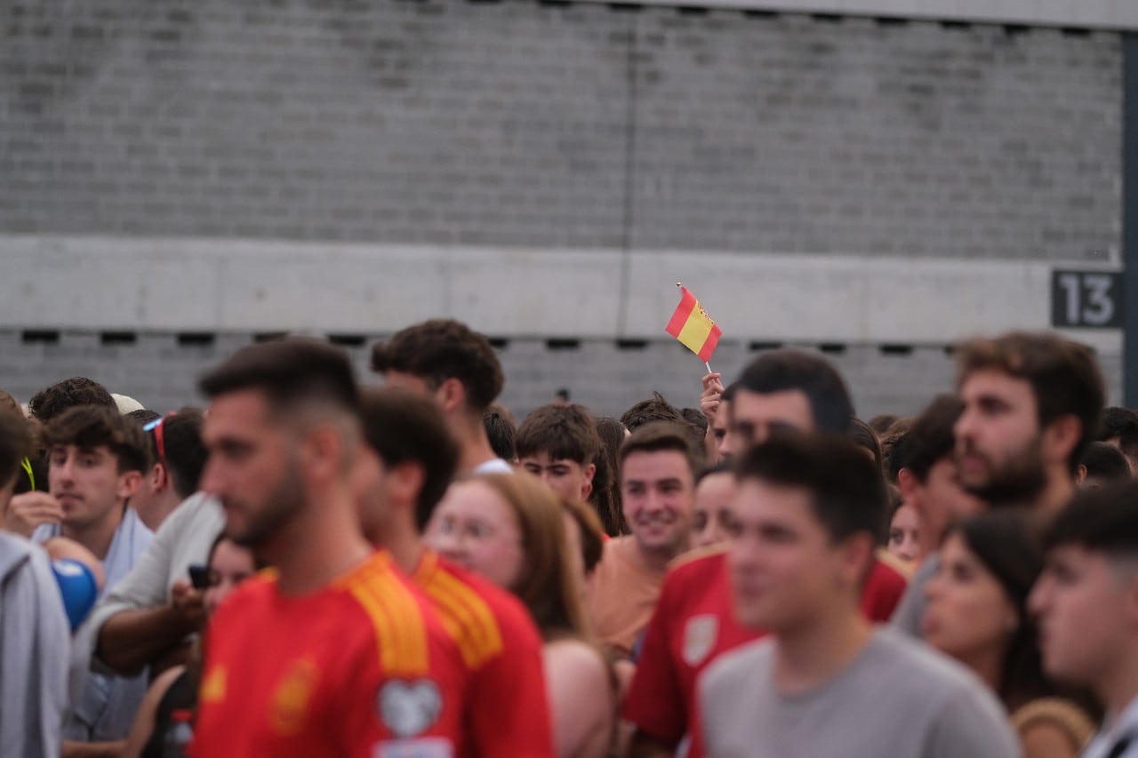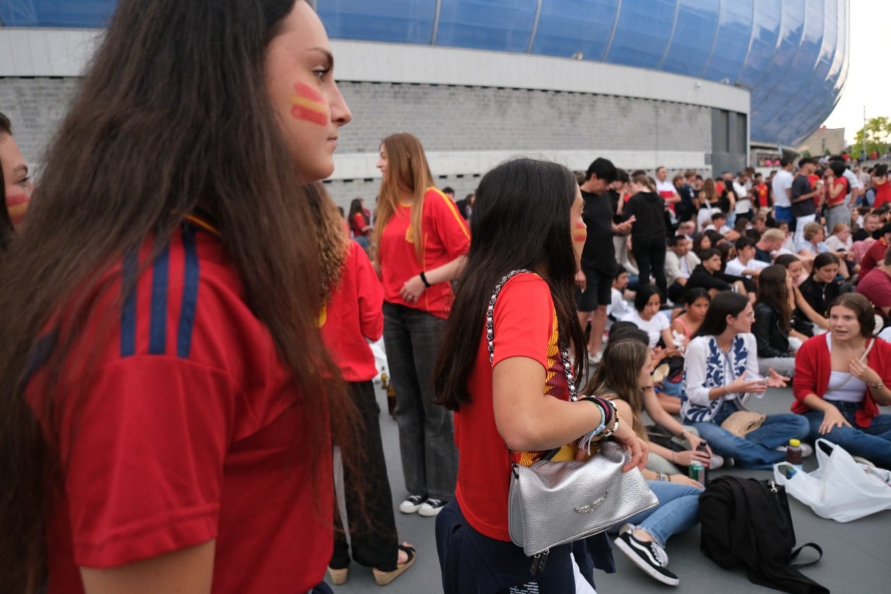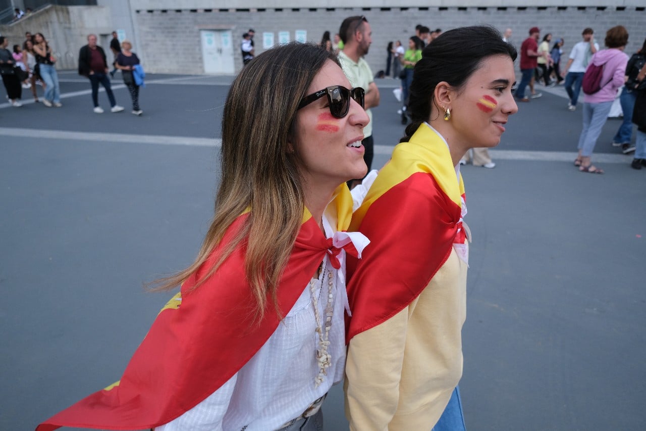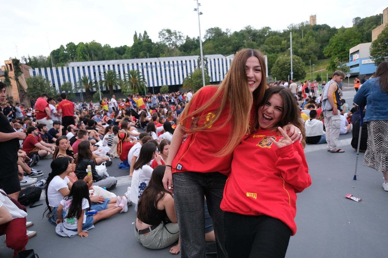 No era tan «gigante» como se decía, pero eso ha sido lo de menos y la final de la Eurocopa España-Inglaterra ha congregado a numerosos donostiarras frente a la pantalla que Donostia Kirola ha instalado en Anoeta para la multitud que ha querido disfrutar del espectáculo deportivo con mucha compañía. Un DJ fue el encargado de amenizar la espera y de generar el buen ambiente que ha ido creciendo hasta el subidón del gol de Nico Williams y la locura, cómo no, del tanto de la victoria del txuriurdin Mikel Oyarzabal.