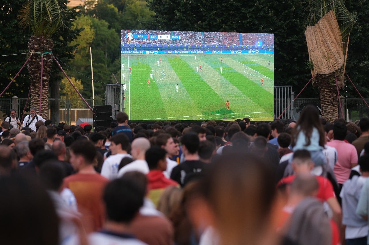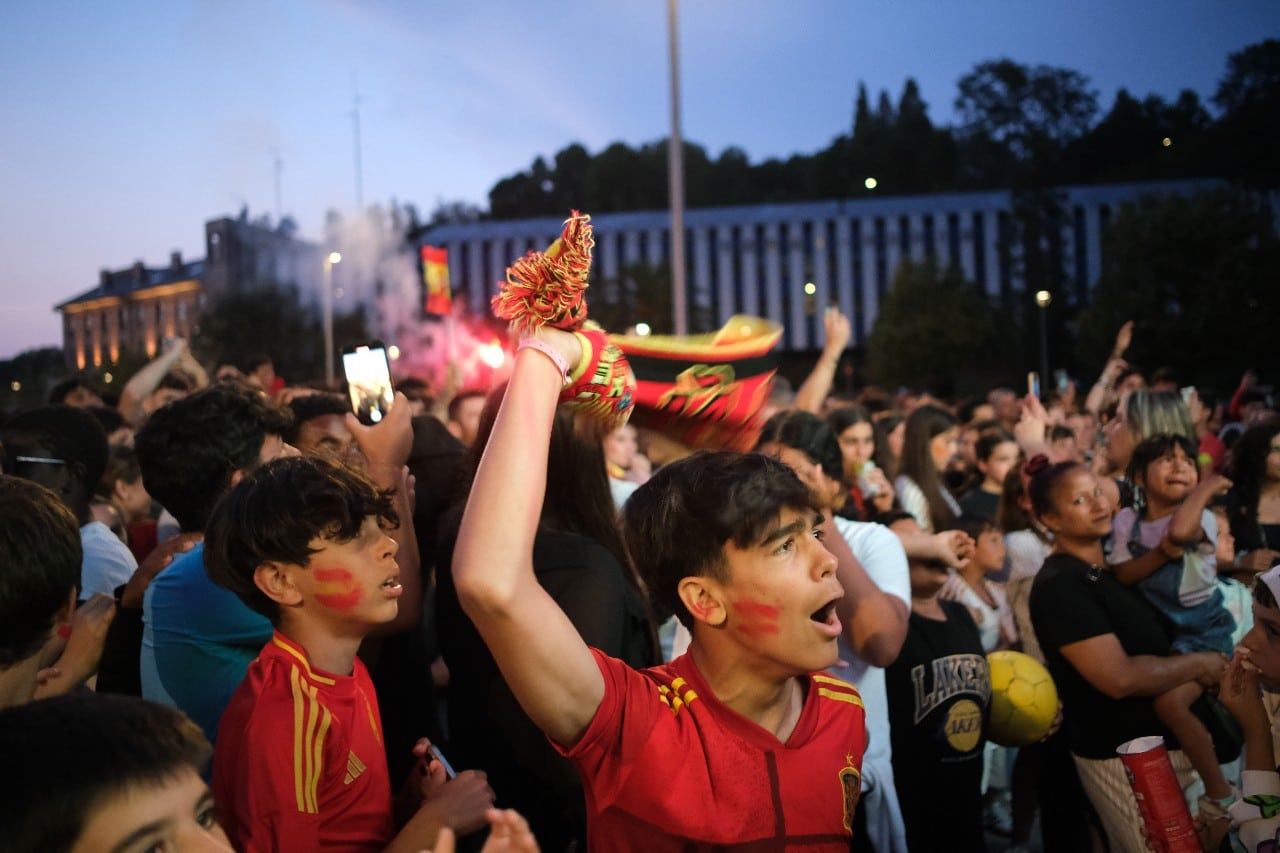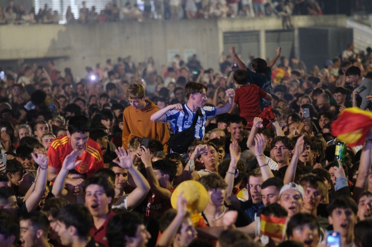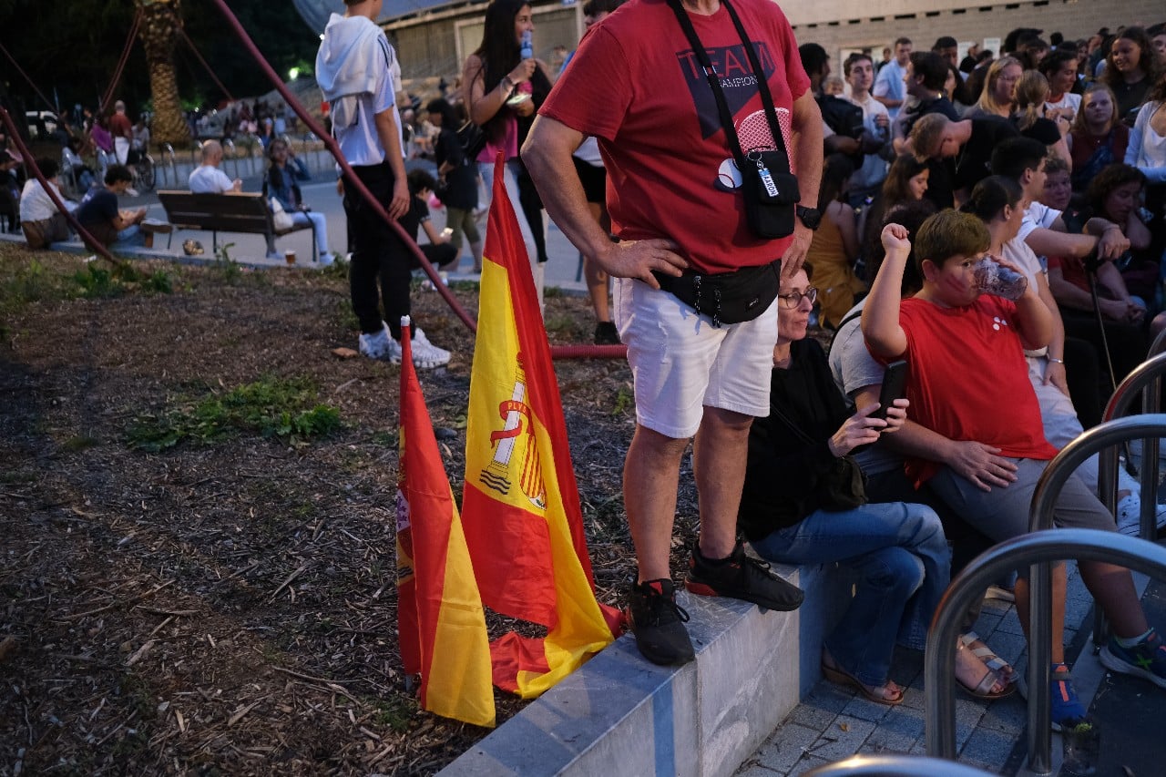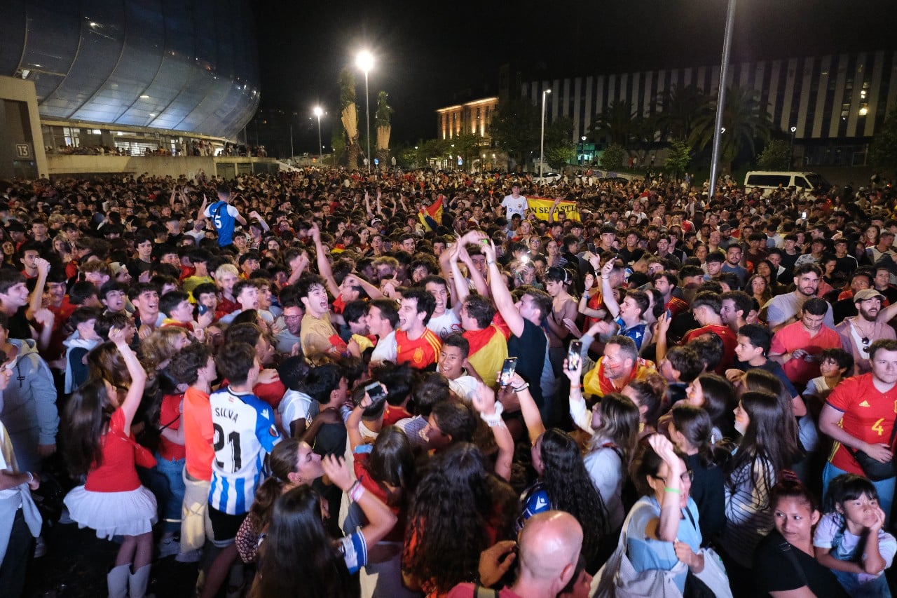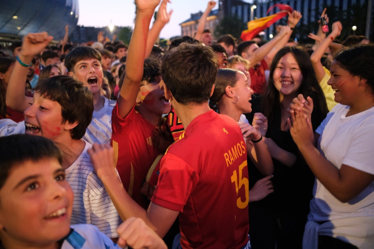 No era tan «gigante» como se decía, pero eso ha sido lo de menos y la final de la Eurocopa España-Inglaterra ha congregado a numerosos donostiarras frente a la pantalla que Donostia Kirola ha instalado en Anoeta para la multitud que ha querido disfrutar del espectáculo deportivo con mucha compañía. Un DJ fue el encargado de amenizar la espera y de generar el buen ambiente que ha ido creciendo hasta el subidón del gol de Nico Williams y la locura, cómo no, del tanto de la victoria del txuriurdin Mikel Oyarzabal.