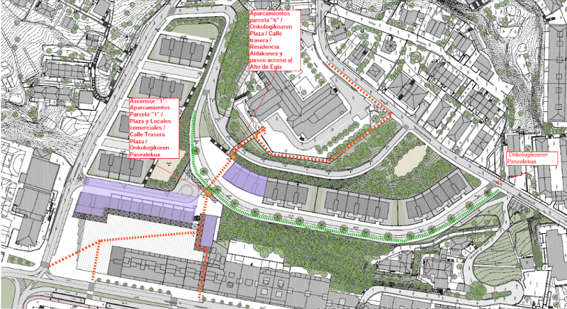 En el apartado de la accesibilidad peatonal al conjunto de la ladera y a la zona alta de la loma de Egia, a través de un sistema de dos ascensores que, desde la rasante de la calle Duque Mandas dén acceso a la Residencia Aldakonea y, a partir de ese punto, por una vía peatonal con pendientes inferiores al 6,00%, a la zona alta de la loma de Egia.