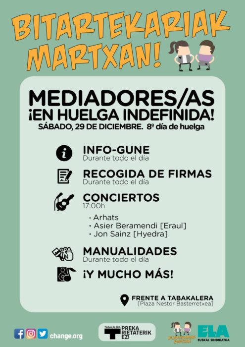 Mal termina el año en uno de los puntos neurálgicos de Tabakalera: la biblioteca Ubik, donde los trece trabajadores del servicio mantienen una huelga indefinida en protesta contra su precariedad laboral. Hoy es el octavo día de un paro que cuenta con el acuerdo de parte importante de los usuarios del servicio, tal y como lo transmiten a diario. Y es que desde el inicio de las protestas los empleados contratados por Sedena han ido paso a paso haciendo pública su situación, que también ha encontrado eco en sindicatos e instituciones, si bien estas últimas responsabilizan exclusivamente a Sedena de la precariedad que sufren los trabajadores.