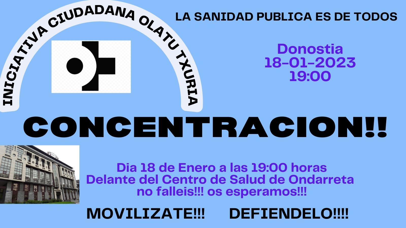 La plataforma ciudadana nacida recientemente, Olatu Txuria, ha convocado una nueva concentración en favor de «la sanidad pública de calidad» y «contra los recortes. Esta cita será delante del Centro de Salud de Ondarreta el día 18 a las 19 horas, y llaman a acudir a la ciudadanía. «Os esperamos a todos, no falléis a los que no nos fallaron», expresan en la convocatoria.