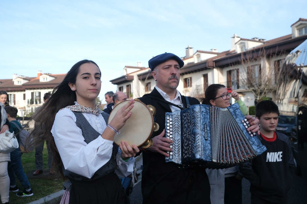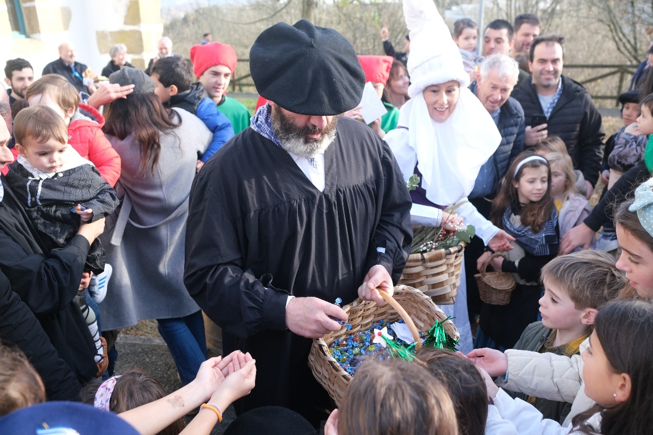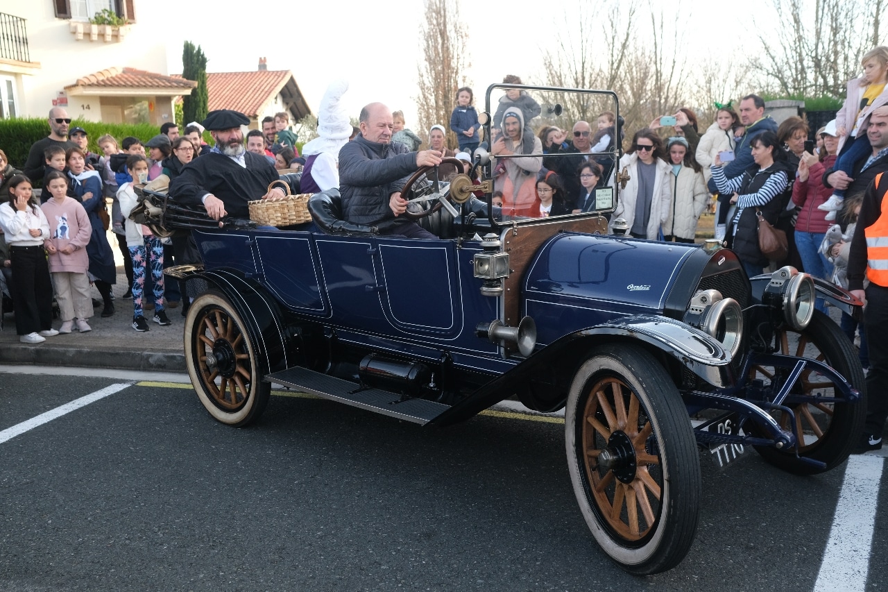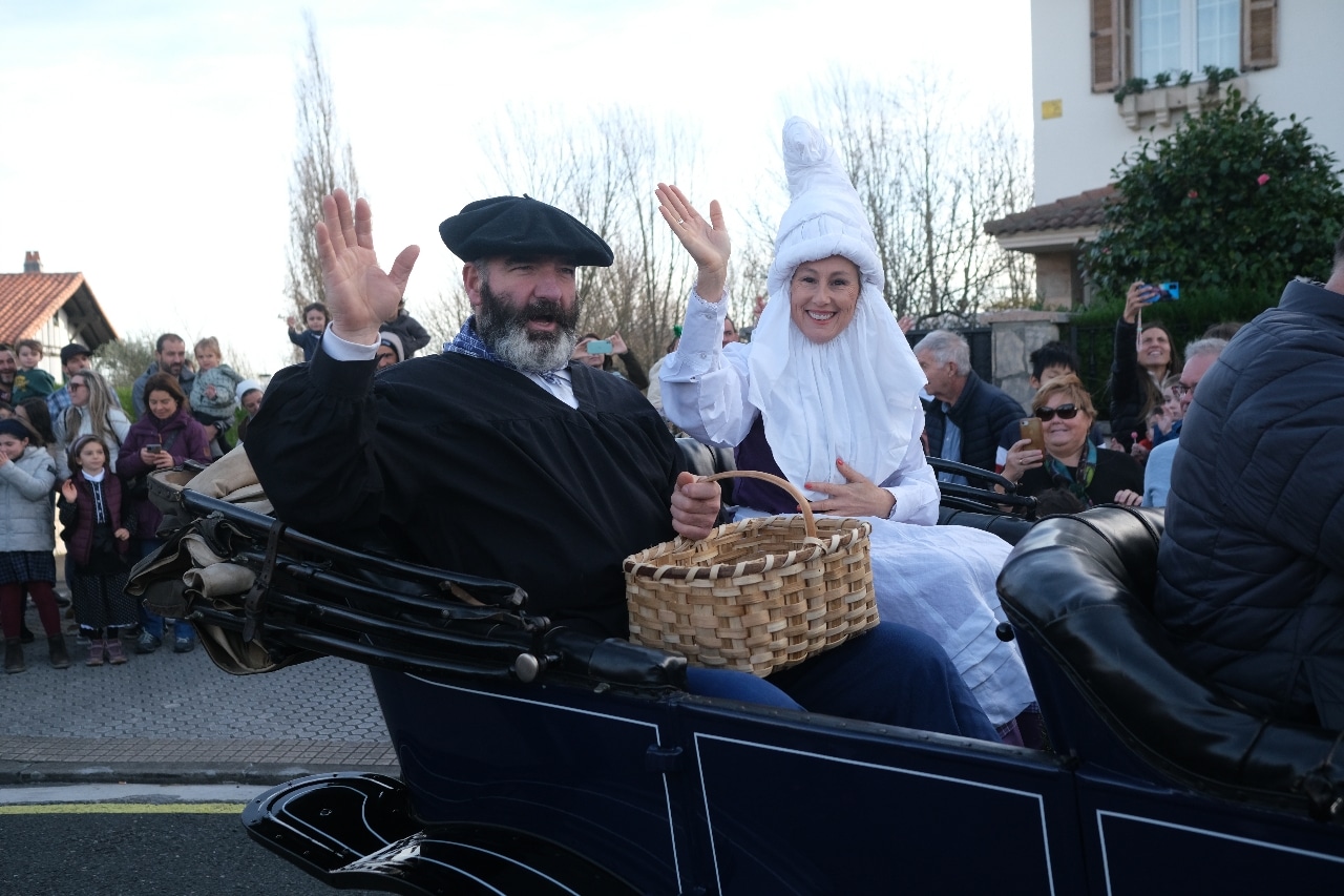 Los donostiarras más madrugadores ya han podido ver a Olentzero y Mari Domingi, que tal y como estaba previsto están Donostia y han salido a las 10.30 horas del caserío Katxola de Aiete bien pertrechados con sus atuendos correspondientes y en un coche clásico al que se han subido encantados. Les sigue un microbús en el que viajan Galtzagorris y trikitilaris.