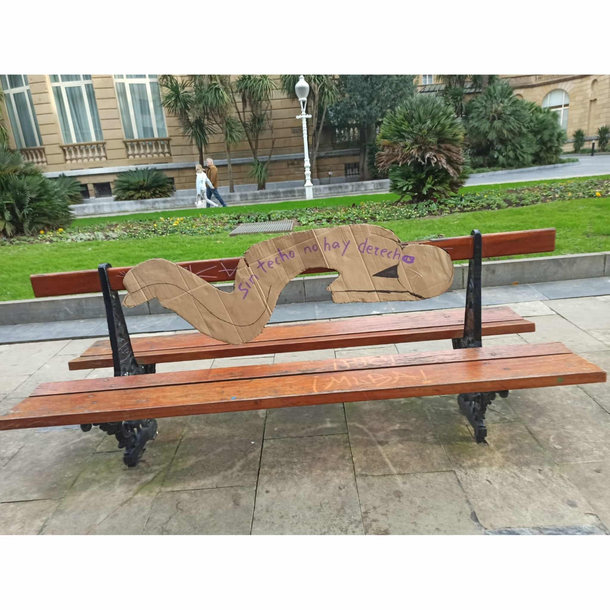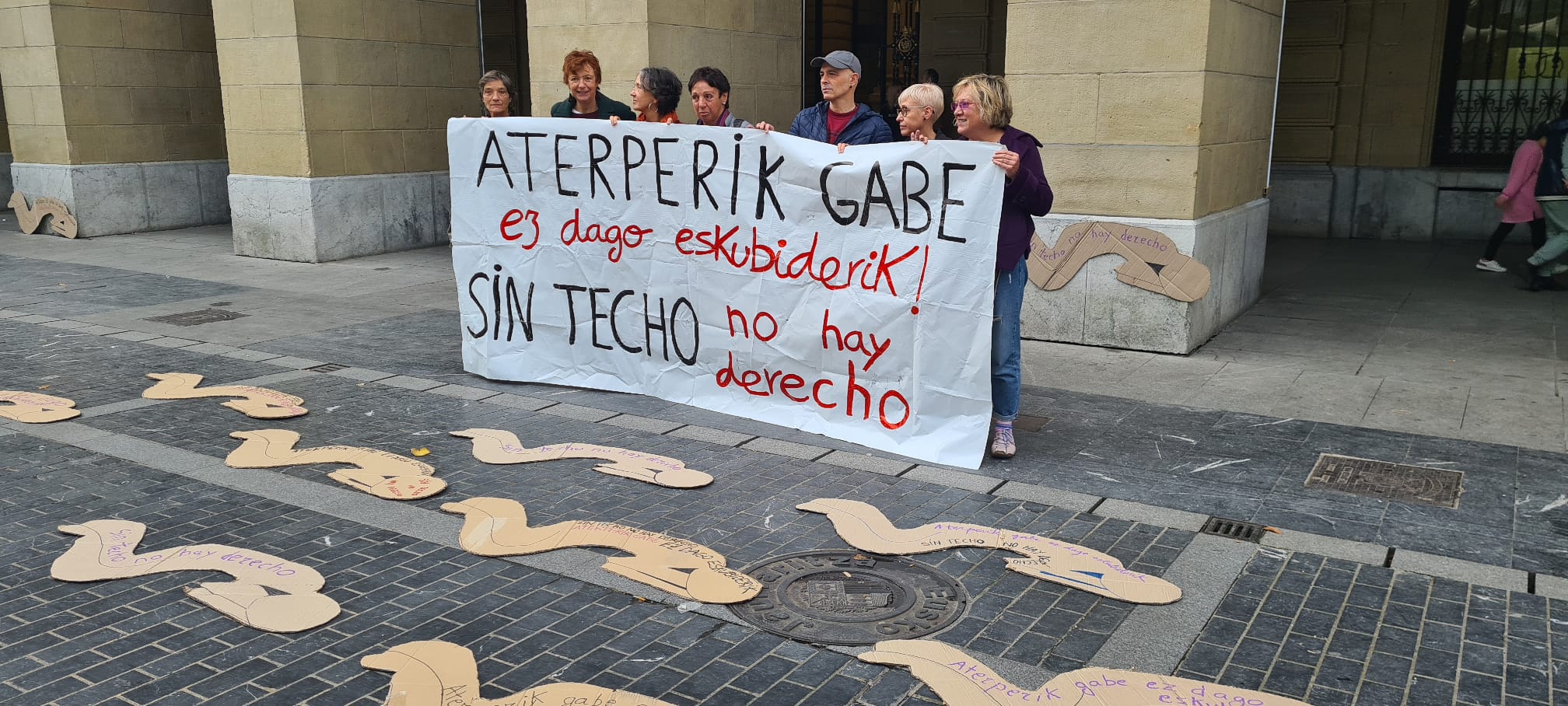 Miembros de la entidad, del Grupo Oarsotealdea y de Bake Ekintza Antimilitarista, se han concentrado este mediodía ante la diputación y después han plasmado la imagen en cartón de personas sin techo durmiendo en distintos puntos de la ciudad.
