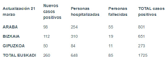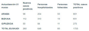 La cifra de personas fallecidas por el COVID19 en Euskadi se eleva a 85 tras las 14 nuevas muertes registradas hasta las 20 horas de ayer. En Euskadi, se han registrado 260 nuevos casos de coronavirus, por lo que la cifra total de personas contagiadas asciende a 1.725. De ellas 648 permanecen hospitalizadas. El número de personas recuperadas de la infección es de 25.