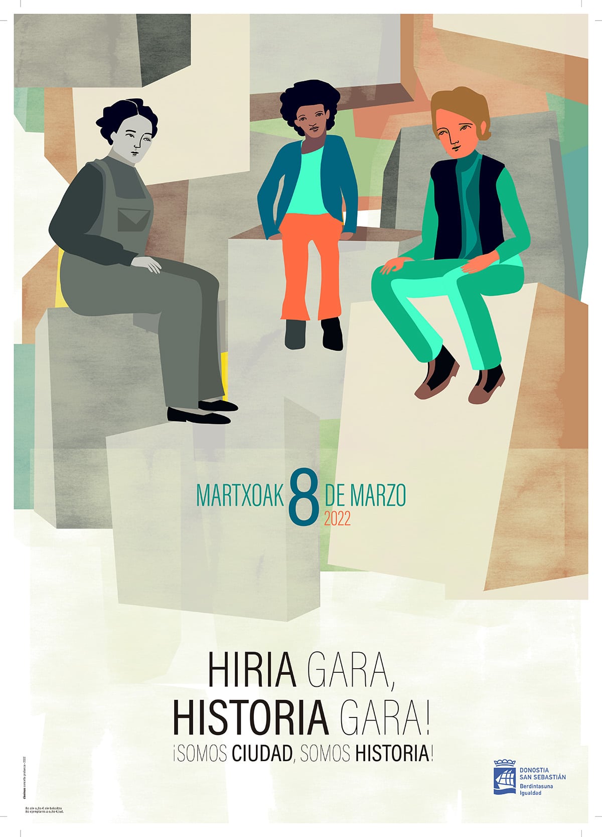 Asociaciones de mujeres, movimientos feministas, el Departamento de Igualdad del Ayuntamiento de San Sebastián, los haurtxokos, gaztelekus y Donostia Kultura han organizado diversos actos de cara al 8M que se recogen en un folleto (Programa8MDonostia). En esta ocasión son 68 las actividades y el cartel ha sido diseñado por Concetta Probenza, que ha querido plasmar la fuerza de las mujeres del pasado, del presente y del futuro.