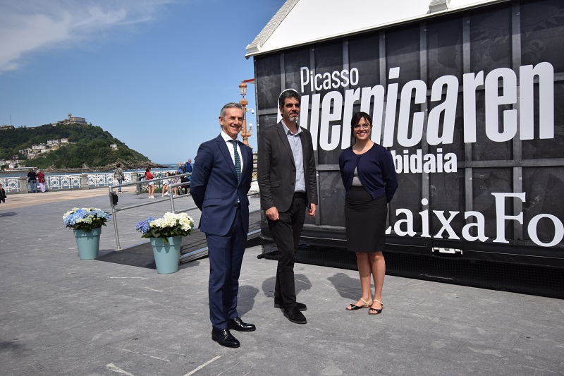 Hoy se ha inaugurado en Alderdi Eder ‘Picasso. El viaje del Guernica’ de la mano del alcalde de Donostia Eneko Goia, el director territorial de CaixaBank en el País Vasco y Cantabria Juan Pedro Badiola, la delegada de la Fundación Bancaria “la Caixa” en el País Vasco y Cantabria Sonia Sáenz y la asesora de la exposición, Manuela Pedrón.