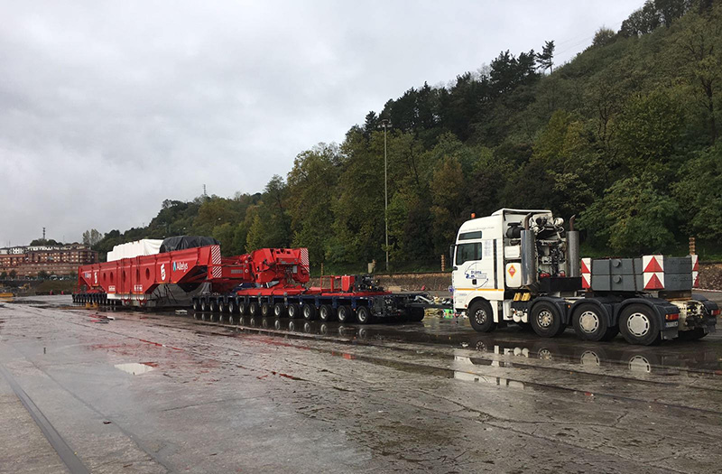 El transporte especial que transporta la “nacelle” de un aerogenerador partirá del puerto de Pasaia el martes por la noche. Tiene una longitud de 94,81 metros, una anchura de 6,54, una altura de 5,32 metros y un peso de 514,4 toneladas, y para poder el traslado se utilizarán tres cabezas tractoras con capacidad de ejercer una fuerza capaz de mover 250 toneladas cada una. Dos de las cabezas tirarán desde adelante mientras una tercera empujará por la parte trasera. Una cuarta cabeza tractora irá en la retaguardia por si es necesaria. Son las medidas de la pieza, más que su peso, las que dificultan el traslado y han provocado la necesidad de este transporte excepcional.