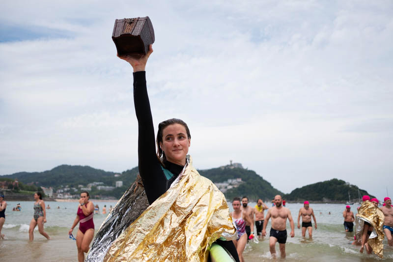 Los bañistas han ido al gabarrón para recoger allí un cofre que habían dejado previamente con los derechos humanos. Y con éste han vuelto a la playa de la Concha.