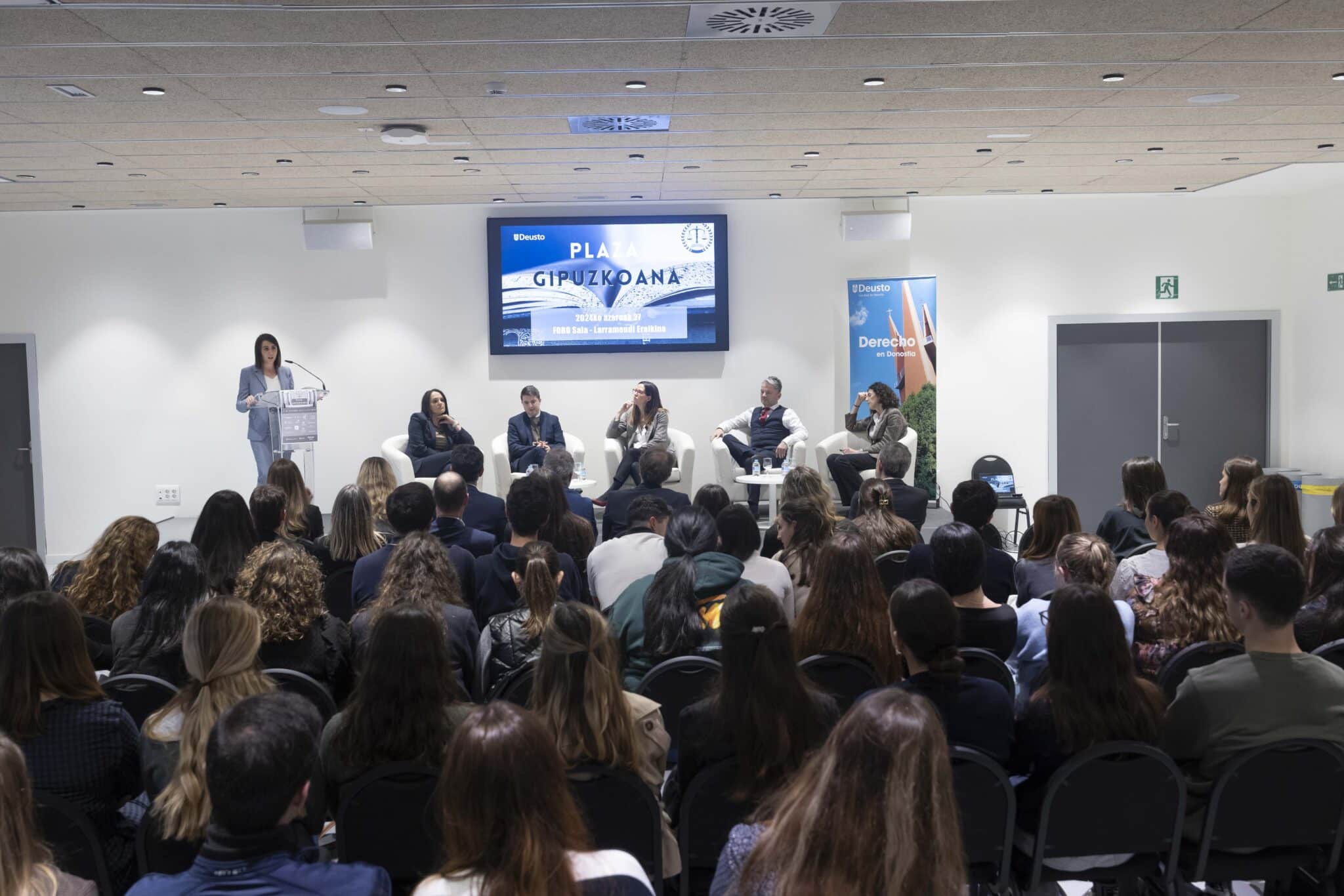 La sala Foro del campus donostiarra de Deusto se llenó ayer con motivo de la primera edición de ‘Plaza Gipuzkoana’, un encuentro en que se dio cita una nutrida representación de la abogacía de los despachos de abogados del territorio y los estudiantes de últimos cursos de grado y dobles grados de Derecho. El objetivo de la jornada fue el de promover el acercamiento y la interacción entre el alumnado y la abogacía guipuzcoana, que contó con una representación del pequeño, mediano y gran despacho.