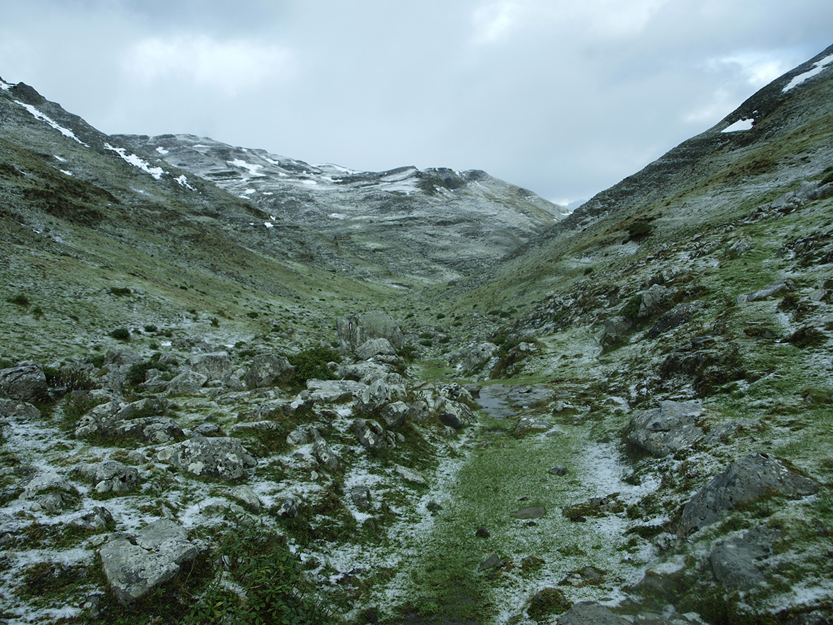 Seguimos ascendiendo pausadamente, hasta alcanzar las bordas de Arritzaga, que nos susurran calladamente desde su misterio de siglos, la vida de aquellos pastores que, desde el neolítico, poblaron estos parajes, pastores que han transmitido su oficio siglo tras siglo, hasta nuestros días. El sendero continúa ganado altura tercamente, y llegamos a la fuente de Pardeluts, agazapada bajo la mágica montaña de Ganbo, que nos vigila desde su trono en lo alto. Continuamos sin perdida, por el senderillo, hasta que de repente, en una zona plagada de piedras, vemos, imponente, monolito de Ama Birgiñ Arria.