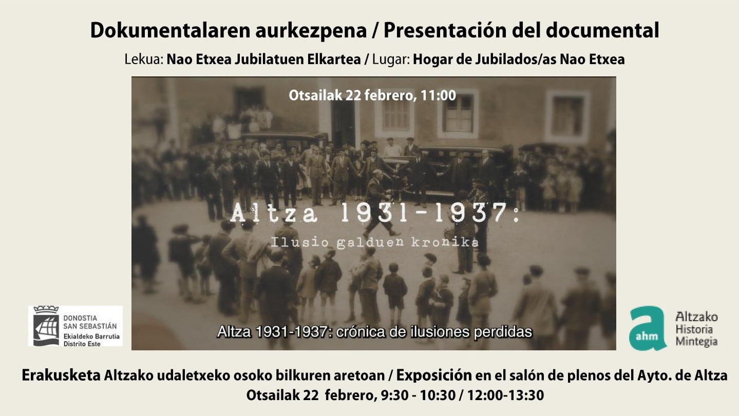 Organizado por el grupo de trabajo de Memoria e Historia del Distrito Este, mañana sábado a las 11 horas tendrá lugar la presentación pública del documental “Altza 1931-1937: Ilusio galduen kronika” (“Altza 1931-1937: Crónica de ilusiones perdidas”), en el local de la Asociación de Jubilados y Pensionistas Nao Etxea.