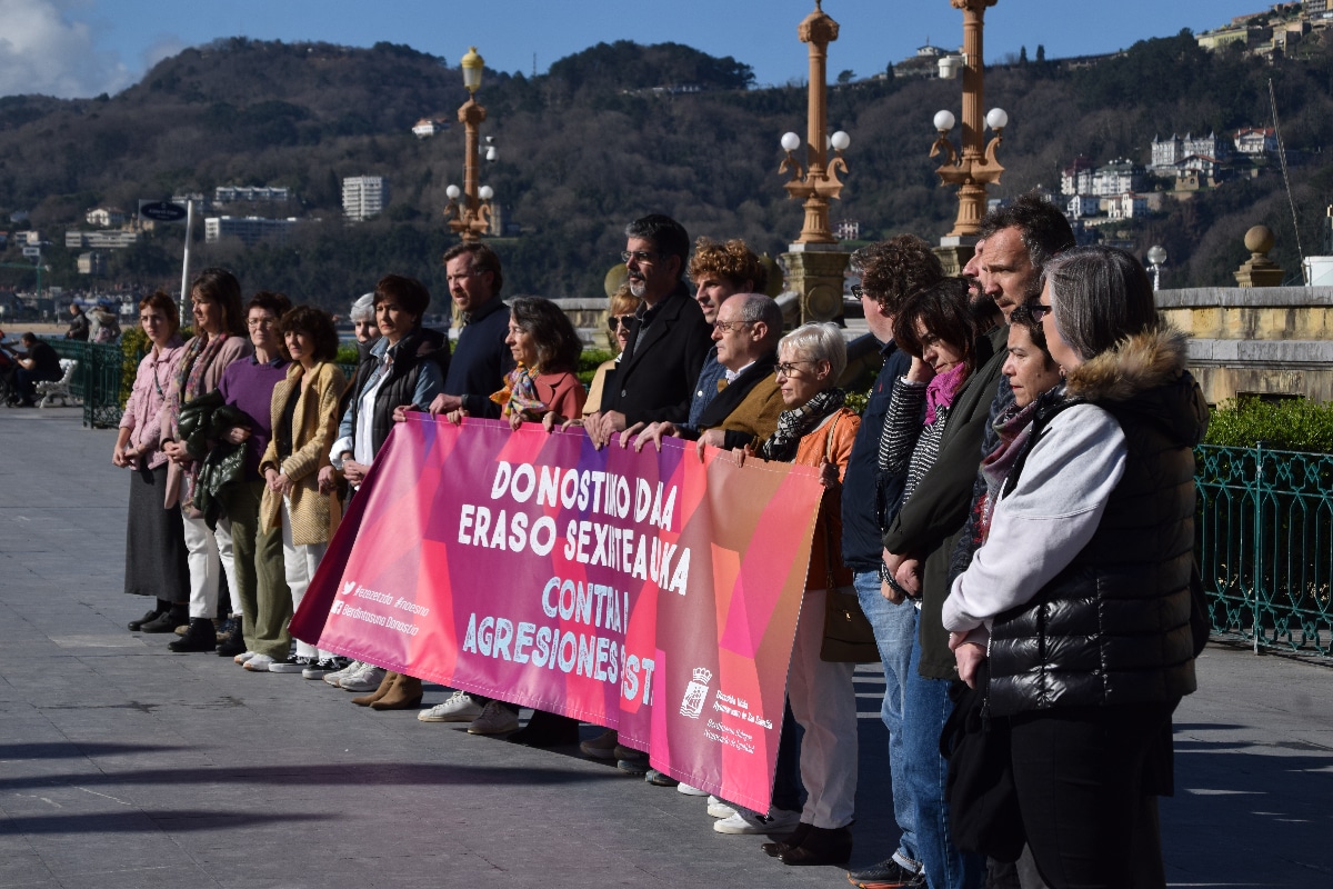 Representantes de los grupos políticos municipales se han manifestado este mediodía de sábado ante el Ayuntamiento de Donostia, en Alderdi Eder, en condena tras la denuncia que se conoció ayer de agresión sexual, retención y robo de una mujer.