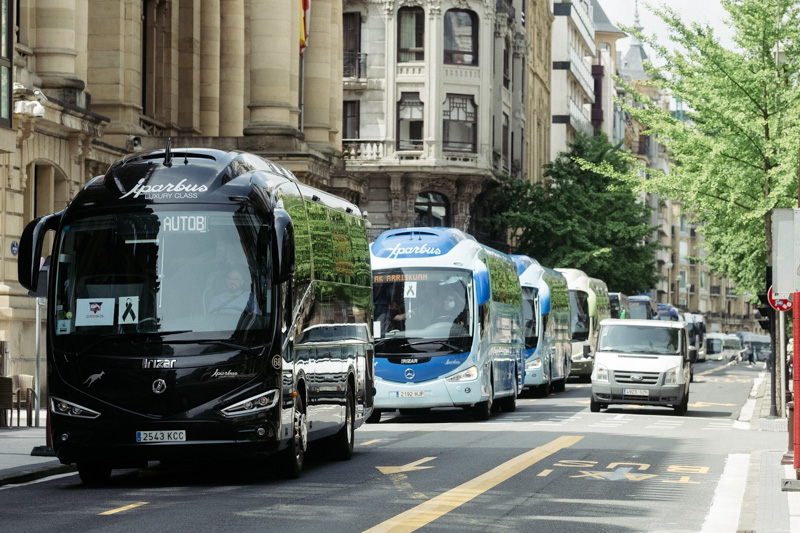 Compañías de transportes se han manifestado hoy en todo el Estado en defensa de los servicios discrecionales y turísticos. También lo han hecho en Donostia con el lema «Autocares en peligro» o «Salvemos el autocar». El motivo de la protesta es que este tipo de transporte ha visto paralizada su actividad por el Covid-19.