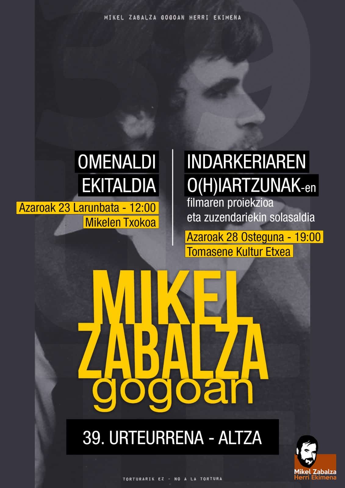 Con un acto este sábado al mediodía y una proyección el día 28, ambas citas en Altza, se homenajeará a Mikel Zabalza Garate cuando se cumplen 39 años de su muerte tras haber sido detenido por la Guardia Civil.