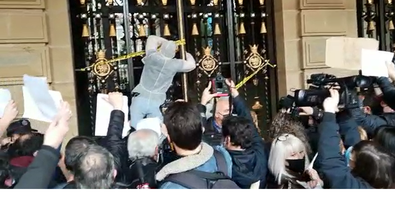 En los barrotes de la entrada del ente foral han puesto precintos amarillos y carteles como los ya citados y se ha producido un pequeño desencuentro con la Ertzaintza que no ha pasado a mayores.