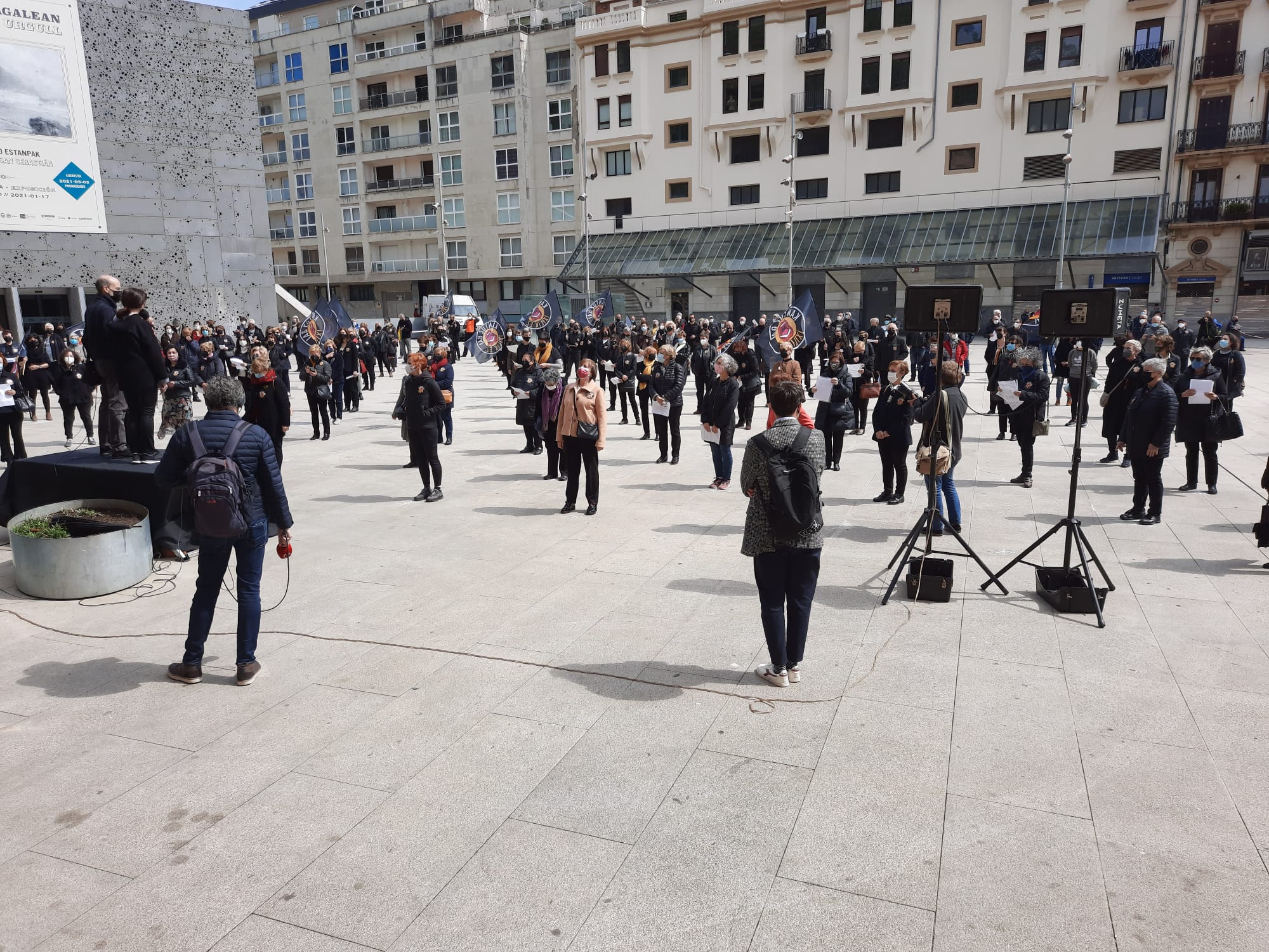 Con este acto la Federación de Coros de Gipuzkoa reivindicó recuperar los ensayos que tienen prohibidos desde noviembre por la normativa del Gobierno Vasco contra la pandemia. Una protesta que también ha tenido lugar simultáneamente en Bilbao y Vitoria, así como en otras localidades como Arrasate, Aramaio o Leintz-Gatzaga.