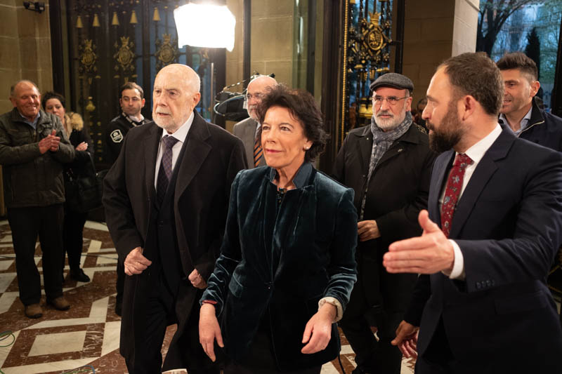 El escritor, emocionado y con buen humor (ha recordado que sólo había visitado la Diputación en una ocasión anterior y fue a causa de Hacienda) ha sido recibido por el grupo de baile del Centro Extremeño de Intxaurrondo y ha recibido las palabras del bertsolari Jon Maia y la música de Gari Mendizabal y Aitor Furundarena.