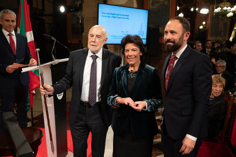 Raúl Guerra Garrido ha recibido esta tarde el homenaje de la Diputación Foral de Gipuzkoa y la Gran Cruz de la Orden Civil de Alfonso X el Sabio, esta última de manos de la ministra de Educación Isabel Celaá. Tanto su compañero de armas literarias Fernando Aramburu, encargado de la laudatio, como las autoridades Celáa y el diputado Denis Itxaso han coincidido en el «ejemplo moral» de Guerra Garrido en años muy difíciles en Euskadi.
