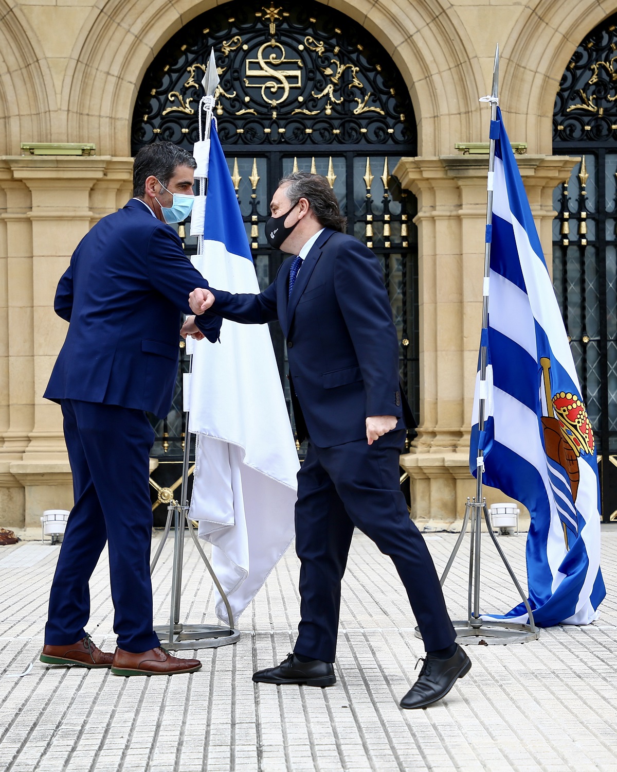 A primera hora de la mañana, el presidente txuri urdin, Jokin Aperribay, ha hecho entrega a Markel Olano de la bandera conmemorativa de la final -que lucirá en el balcón del palacio foral desde el miércoles-, mientras que el Diputado General le ha cedido la bandera de Gipuzkoa. Harkaitz Millán, diputado de deportes, el vicepresidente realista, Ángel Oyarzun, además de Nerea Aramburu y Fermín Altuna, consejeros del Club, también han acudido al acto de entrega.