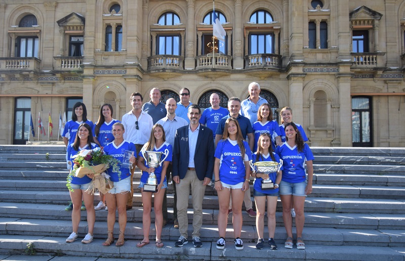 Eneko Goia hizo entrega de una placa conmemorativa al equipo, al que se dirigió asegurando que «la verdad es que se acaban los calificativos». «Es un orgullo ver cómo representáis a esta ciudad, lleguen títulos o no, con gran esfuerzo y dedicación. Pero es que a ese esfuerzo y dedicación se le suman títulos como esta liga, ganada hace tres semanas, y la copa que ayer mismo (por el domingo) ganasteis en Madrid. La primera vez que conseguís el doblete. Eskerrik asko y zorionak».