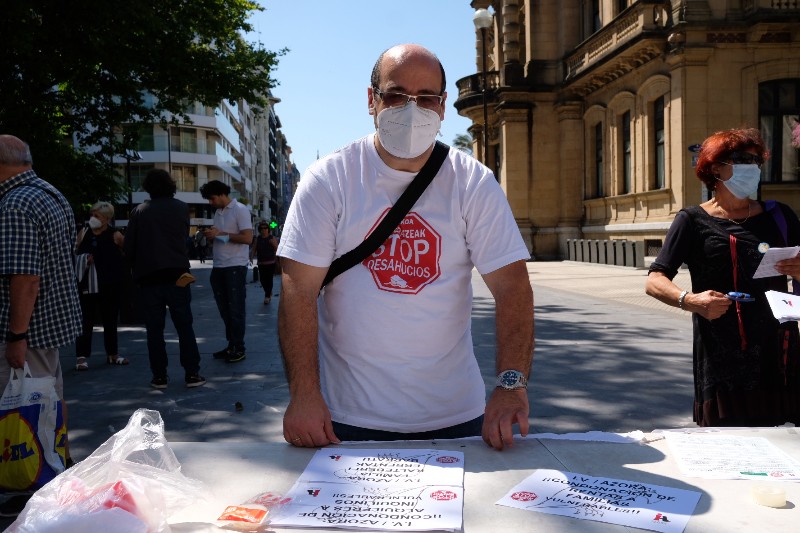 Stop Desahucios ha recuperado hoy el pulso de la calle con una movilización en favor de dos familias que residen en viviendas de la empresa Azora, en Amara Viejo, y que no han podido afrontar el alquiler durante el Estado de Alarma. Así que podrían resultar desalojadas. La plataforma vuelve a la calle tras el confinamiento, sí, pero los del confinamiento no han sido meses de descanso precisamente. La grieta social que se ha abierto con el coronavirus fue patente desde el primer minuto y el teléfono no ha parado de sonar, como explican Rosa García, Arturo Val del Omo y Marce García. «¿Qué ocurrirá con familias que alquilan habitaciones por 400 euros y dependen de sectores como la hostelería o del trabajo doméstico?», se preguntan mientras enarbolan su número de contacto (669428598) para quien lo necesite.