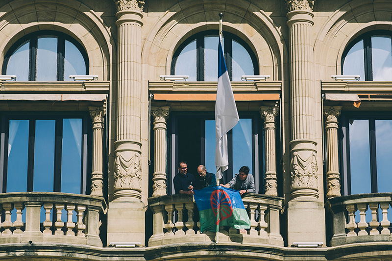 Cerca de medio centenar de personas ha participado esta mañana en los actos del Día Internacional del Pueblo Gitano, que ha contado con representación de las asociaciones gipuzkoanas que aglutinan a este colectivo y también con miembros del Ayuntamiento donostiarra encabezados por el alcalde Eneko Goia.