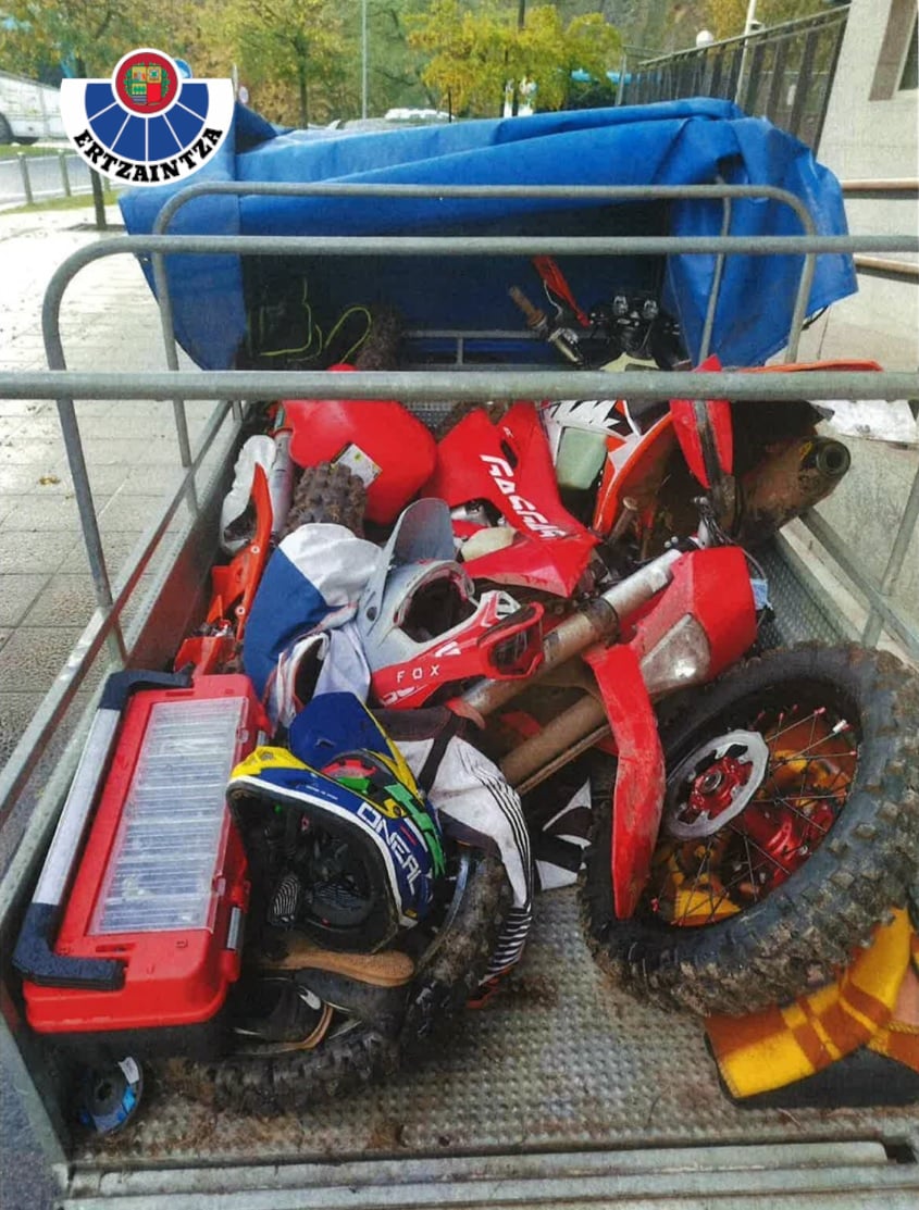 Agentes de la Ertzaintza han detenido en la madrugada de este viernes a dos hombres de 41 y 49 años tras ser sorprendidos en la autopista AP-1 en Arrasate a bordo de un vehículo con un remolque en cuyo interior portaban tres motos, parcialmente desmontadas, sustraídas en unas pruebas mundiales de Enduro en Pontevedra.