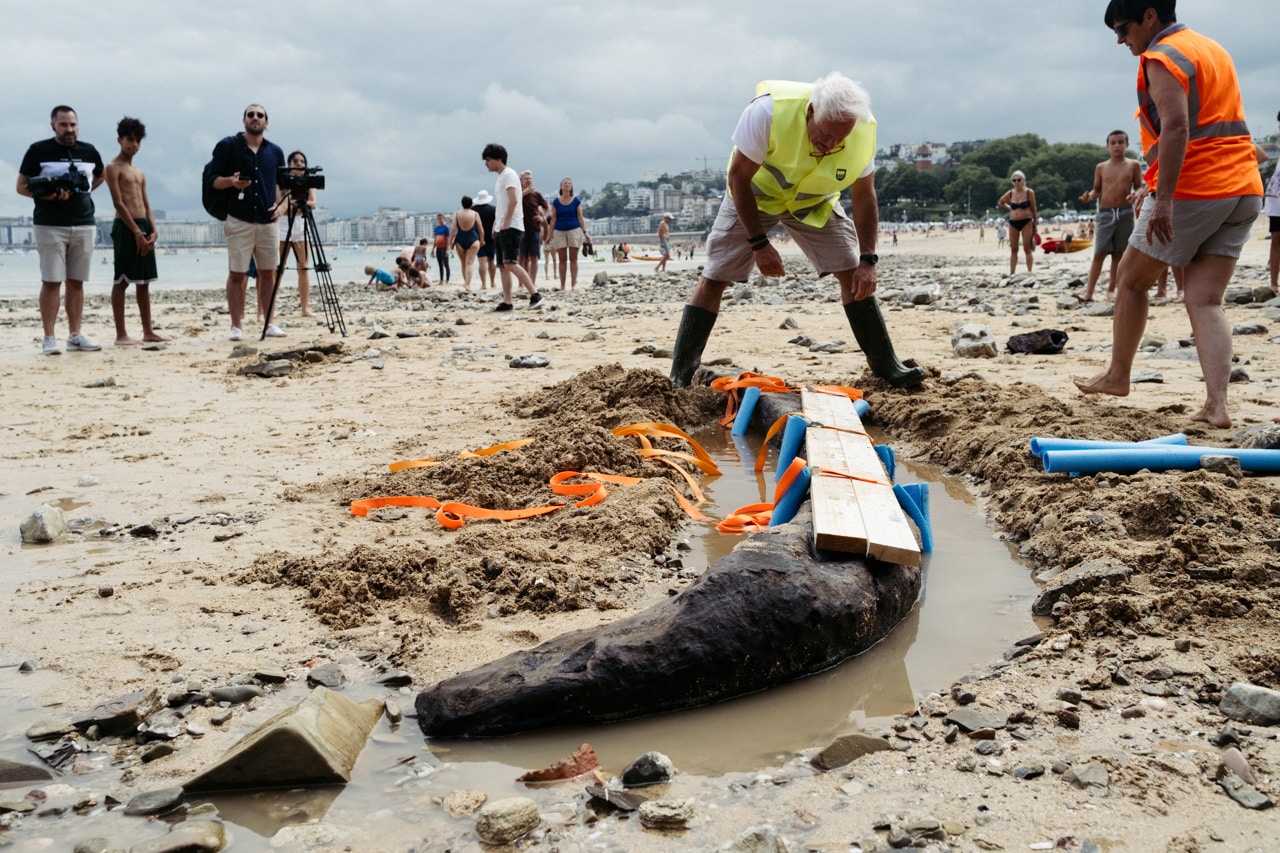 Este lunes miembros de la Sociedad de Ciencias Aranzadi hallaron un tronco de madera junto al muro de costa más cercano al Paseo de Eduardo Chillida. Pusieron los hechos en conocimiento del Servicio foral de Patrimonio que, tras analizarlo y acordar su traslado, lo ha retirado durante la bajamar de este miércoles.