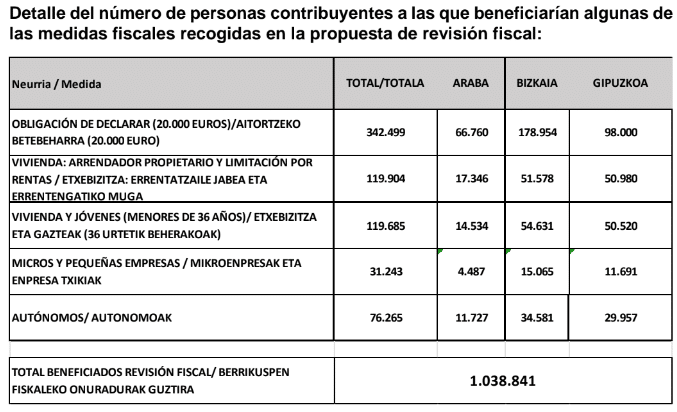 Han puesto en valor que sus medidas beneficiarían a 1.038.841 contribuyentes en la Comunidad Autónoma Vasca, «una cifra muy relevante si se tiene en cuenta que la población total en el territorio es de 2,2 millones de personas».