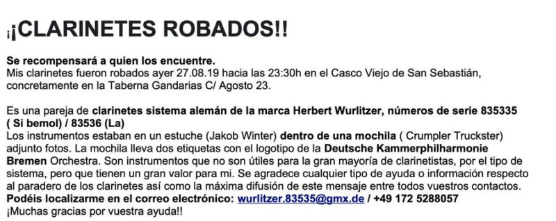 Quincena Musical ha lanzado un mensaje urgente: ayer fueron robados en la Parte Vieja dos clarinetes de la marca alemana Herbert Wurlitzer con los números de serie 835335 y 83536. El robo se produjo a las 23.30 horas en Casa Gandarias y la víctima, músico en la Orquesta de Bremen, apela al valor sentimental de los mismos y da un correo electrónico para ser localizado.