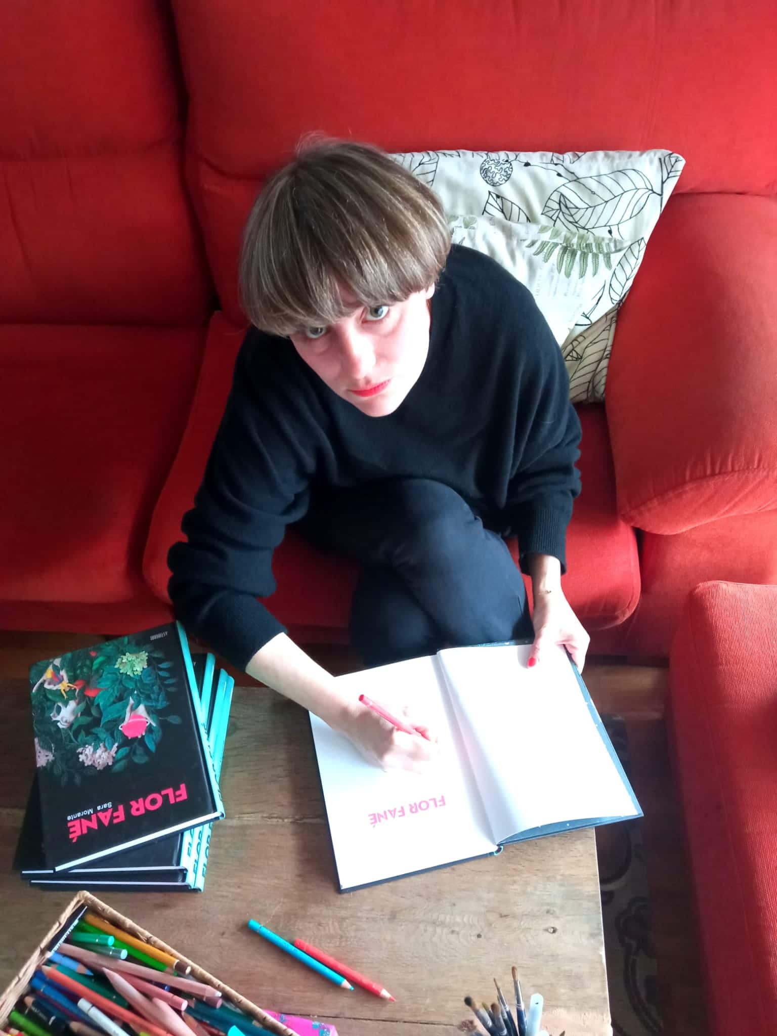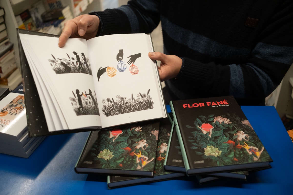 La ilustradora Sara Morante (Torrelavega, 1976) ha presentado en Librería Zubieta su último trabajo que es, además, el segundo en que se lanza a elaborar textos e imágenes con el resultado de un «género híbrido» en que se siente muy cómoda. ‘Flor fané’ acaba de ver la luz (esta mañana estaban aún sin desembalar las cajas en la librería), y en conversación con Donostitik la autora ha narrado cómo nació esta historia sobre violencia con una protagonista infantil, Olga, que va creciendo conforme avanza la obra. Para las ilustraciones, por cierto, Morante evitó lo digital y recuperó las técnicas de siempre. «Ha sido como volver al principio», afirma esta ilustradora con once años de carrera y numerosos trabajos a sus espaldas. Con esta presentación Librería Zubieta encara la recta final del año reuniendo, como siempre, a los creadores y a su público.
