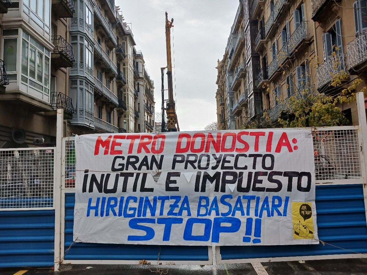 El colectivo Satorralaia ha aprovechado que hoy 8 de diciembre se celebra en Europa el Día Internacional contra los Grandes Proyectos Inútiles e Impuestos y ha desplegado pancartas en las obras del Metro donostiarra.