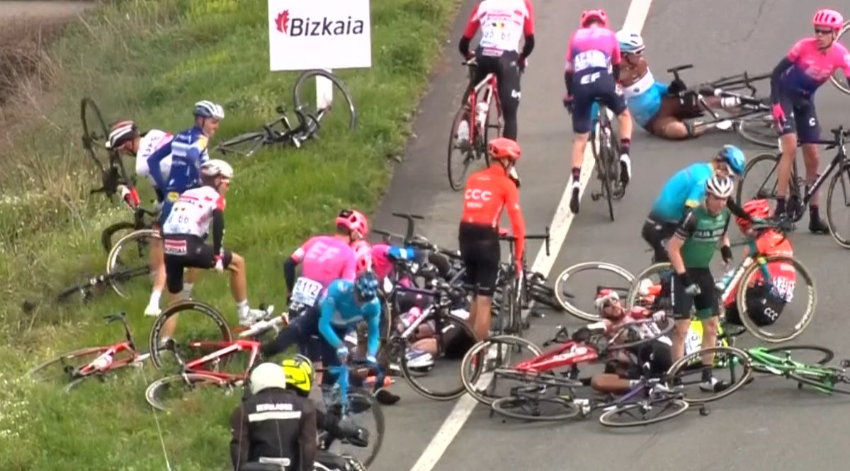 La tercera etapa de la Itzulia ha sido protagonizada por una caída tremenda en la que se vieron involucrados ciclistas como Alaphilippe, Kwiatkowski, Thomas, Castroviejo, Hansen y Enric Mas cuando circulaban a gran velocidad. Con ello Schachmann, que viene muy fuerte, mantiene el liderato de la Itzulia.