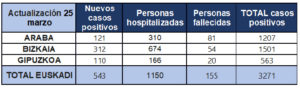 En las últimas horas 543 nuevos positivos han elevado a 3.271 el número de personas contagiadas de COVID19 en Euskadi. De ellas 1.150 se encuentran ingresadas en los hospitales vascos. Hasta las 20 horas de ayer se registraron 22 fallecimientos, por lo que la cifra de muertes en Euskadi asciende a 155 personas. En Gipuzkoa el número de positivos es de 563 (166 de ellos, hospitalizados). Y han fallecido veinte personas.