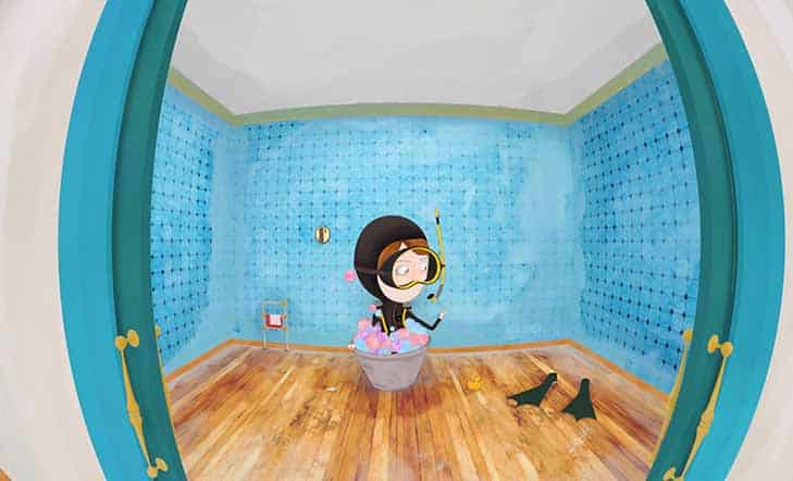 Silvia & the spyglass propone un viaje de 4 minutos, una caricia de cuatro minutos sería más apropiado, de la mano de sus mujeres asimétricas y hermosas. Basta con sentarse, pertrecharse con las gafas de realidad virtual y dejarse llevar por su mundo colorido y evocador de 360º con música y texto de fondo. Y de pronto se termina la experiencia y siente el visitante que 4 minutos bastan para desear seguir explorando el otro lado, el de la artista.