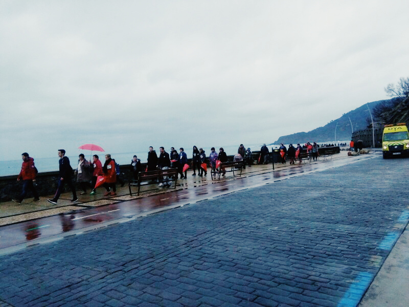 Los caminantes han salido de Sagües bien pertrechados con su dorsal, sus mochilas y paraguas y han culminado la marcha en el Peine del Viento.