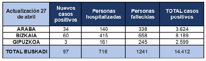 Han sido 97 los nuevos casos registrados de coronavirus en las últimas horas en Euskadi, sólo tres en Gipuzkoa, por lo que el número de contagios se eleva a 14.412 en los tres territorios y han fallecido 1.241 personas. En Gipuzkoa el número de positivos es de 2.599 y hay 161 personas hospitalizadas. Además han fallecido 245 personas. El número de muertes se ha incrementado en once personas desde ayer, con lo que los fallecimientos por Covid-19 en Euskadi ascienden a 1.241 personas. En relación a las personas recuperadas o dadas de alta, la cifra asciende a 9.840, un 68% del total de casos confirmados.