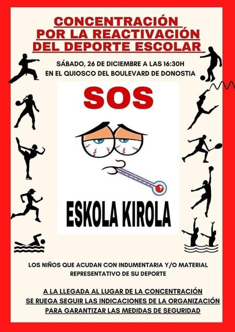 Sos Eskola Kirola ha convocado este sábado 26 una concentración a las 16.30 horas en el quiosco del Boulevard «para luchar por el derecho de todos los niños a practicar deporte y pedir la reactivación del deporte escolar».