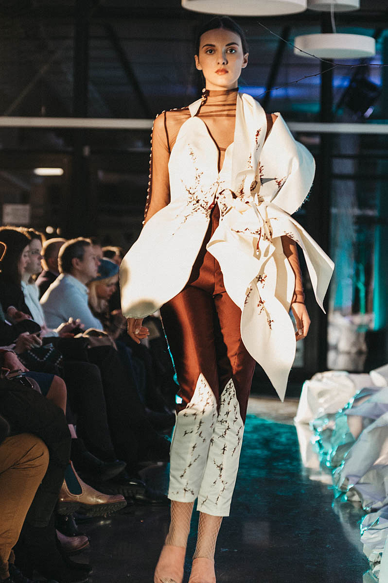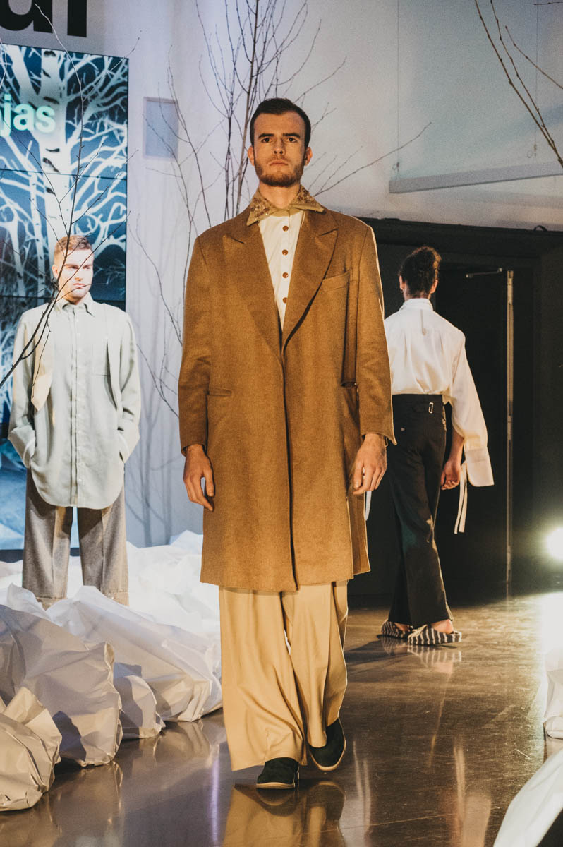La catalana afincada en Donostia, Clara Virgili mostró una colección inspirada en Bertolt Bretch y con 6 diseños llenos de pequeños detalles. Entiende el diseño como un proceso artístico y creativo y eso se ve en sus prendas, donde experimenta con el patronaje, las texturas y costuras. Ropa amplia con cortes limpios en tonos grises y ocres.